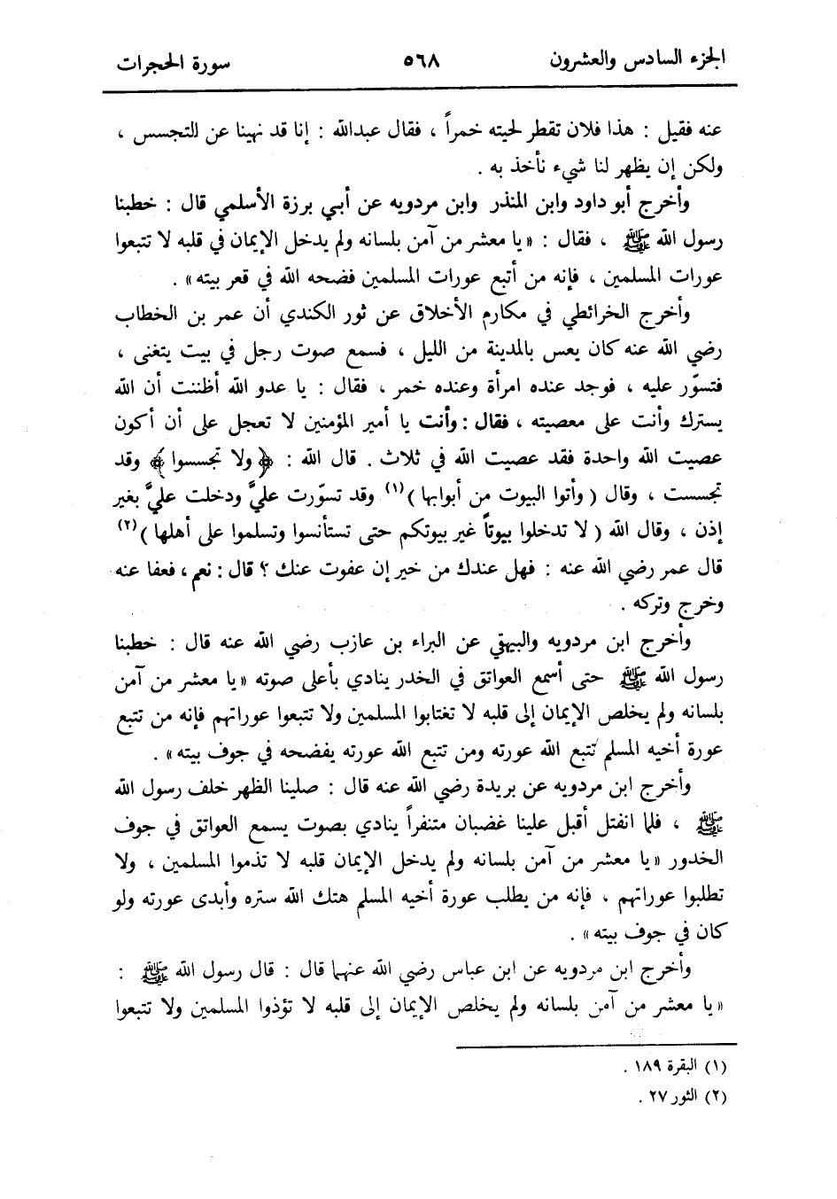 وَأخرج ابْن مرْدَوَيْه وَالْبَيْهَقِيّ عَن الْبَراء بن عَازِب رَضِي الله عَنهُ قَالَ: خَطَبنَا رَسُول الله صلى الله عَلَيْهِ وَسلم حَتَّى أسمع الْعَوَاتِق فِي الخدر يُنَادي بِأَعْلَى صَوته يَا معشر من آمن بِلِسَانِهِ وَلم يخلص الإِيمان إِلَى قلبه لَا تَغْتَابُوا الْمُسلمين وَلَا تتبعوا عَوْرَاتهمْ فَإِنَّهُ من تتبع عَورَة أَخِيه الْمُسلم تتبع الله عَوْرَته وَمن تتبع الله عَوْرَته يَفْضَحهُ فِي جَوف بَيته