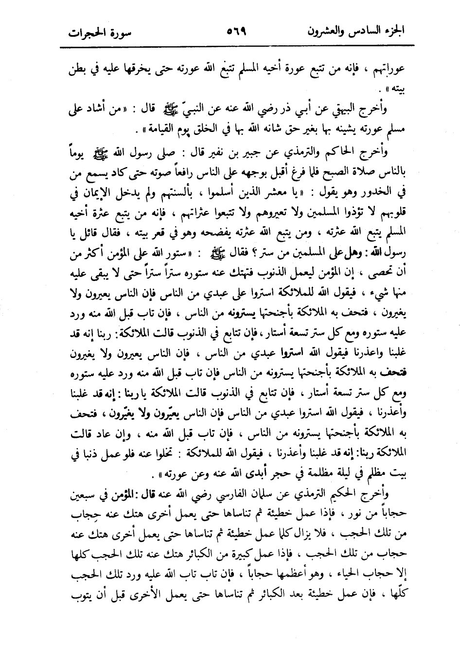 وَأخرج الْحَاكِم وَالتِّرْمِذِيّ عَن جُبَير بن نفير قَالَ: صلى رَسُول الله صلى الله عَلَيْهِ وَسلم يَوْمًا بِالنَّاسِ صَلَاة الصُّبْح فَلَمَّا فرغ أقبل بِوَجْهِهِ على النَّاس رَافعا صَوته حَتَّى كَاد يسمع من فِي الْخُدُور وَهُوَ يَقُول: يَا معشر الَّذين أَسْلمُوا بألسنتهم وَلم يدْخل الإِيمان فِي قُلُوبهم لَا تُؤْذُوا الْمُسلمين وَلَا تُعَيِّرُوهُمْ وَلَا تتبعوا عثراتهم فَإِنَّهُ من يتبع عَثْرَة أَخِيه الْمُسلم يتبع الله عثرته وَمن يتبع الله عثرته يَفْضَحهُ وَهُوَ فِي قَعْر بَيته فَقَالَ قَائِل يَا رَسُول الله: وَهل على الْمُسلمين من ستر فَقَالَ صلى الله عَلَيْهِ وَسلم: ستور الله على الْمُؤمن أَكثر من أَن تحصى إِن الْمُؤمن ليعْمَل الذُّنُوب فتهتك عَنهُ ستوره سترا سترا حَتَّى لَا يبْقى عَلَيْهِ مِنْهَا شَيْء فَيَقُول الله للْمَلَائكَة استروا على عَبدِي من النَّاس فَإِن النَّاس يعيرون وَلَا يغيرون فتحف بِهِ الْمَلَائِكَة بأجنحتها يسترونه من النَّاس فَإِن تَابَ قبل الله مِنْهُ ورد عَلَيْهِ ستوره وَمَعَ كل ستر تِسْعَة أَسْتَار فَإِن تتَابع فِي الذُّنُوب قَالَت الْمَلَائِكَة: رَبنَا إِنَّه قد غلبنا واعذرنا فَيَقُول الله استروا عَبدِي من النَّاس فَإِن النَّاس يعيرون وَلَا يغيرون فتحف بِهِ الْمَلَائِكَة بأجنحتها يسترونه من النَّاس فَإِن تَابَ قبل الله مِنْهُ ورد عَلَيْهِ ستوره وَمَعَ كل ستر تِسْعَة أَسْتَار فَإِن تتَابع فِي الذُّنُوب قَالَت الْمَلَائِكَة يَا رَبنَا إِنَّه قد غلبنا واعذرنا فَيَقُول الله استروا عَبدِي من النَّاس فَإِن النَّاس يعيرون وَلَا يغيرون فتحف بِهِ الْمَلَائِكَة بأجنحتها يسترونه من النَّاس فَإِن تَابَ قبل الله مِنْهُ وَإِن عَاد قَالَت الْمَلَائِكَة رَبنَا إِنَّه قد غلبنا وأعذرنا فَيَقُول الله للْمَلَائكَة: تَخْلُو عَنهُ فَلَو عمل ذَنبا فِي بَيت مظلم فِي لَيْلَة مظْلمَة فِي حجر أبدى الله عَنهُ وَعَن عَوْرَته