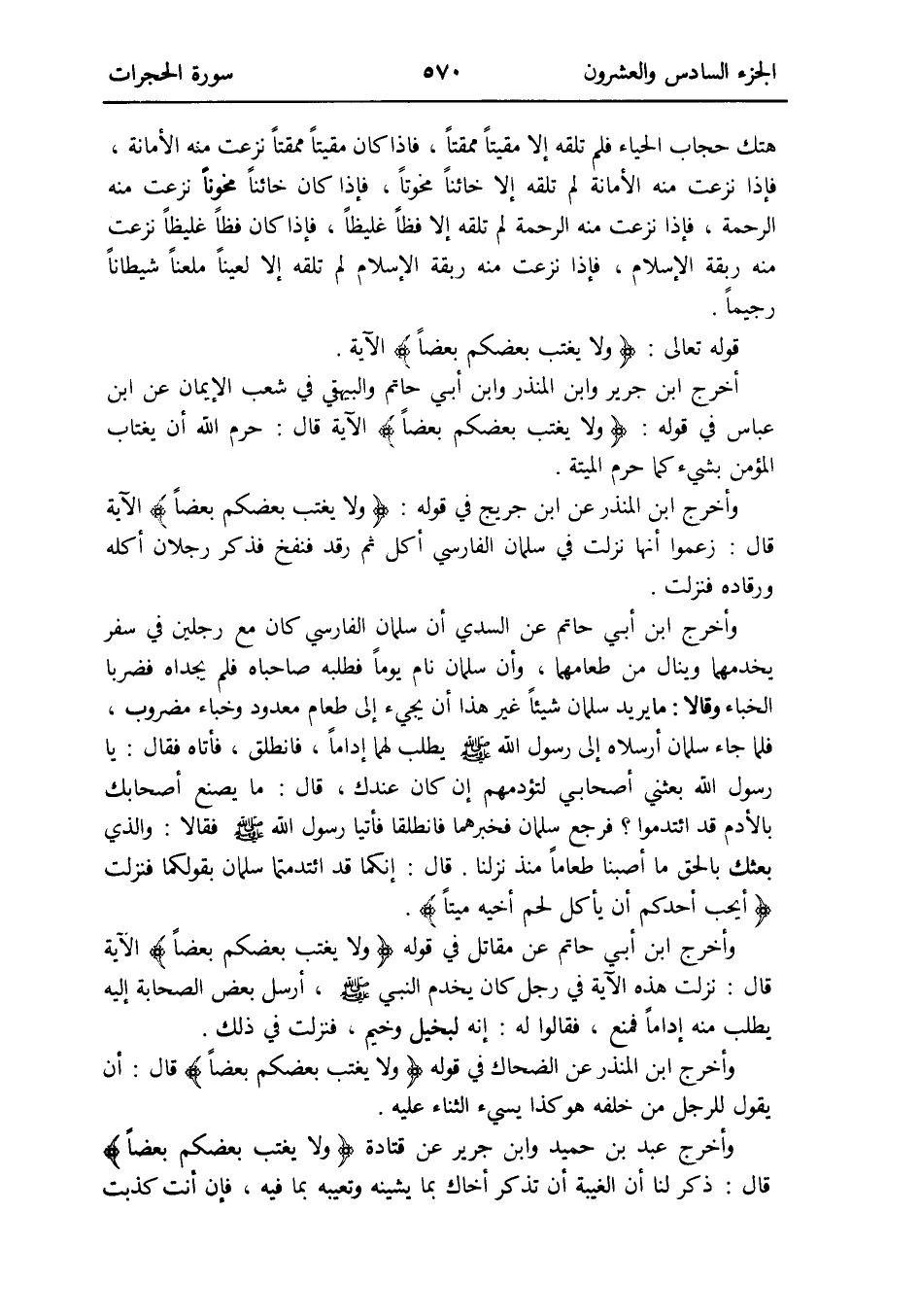 وَأخرج ابْن الْمُنْذر عَن ابْن جريج فِي قَوْله: {وَلَا يغتب بَعْضكُم بَعْضًا} الْآيَة قَالَ: زَعَمُوا أَنَّهَا نزلت فِي سلمَان الْفَارِسِي أكل ثمَّ رقد فَنفخ فَذكر رجلَانِ أكله ورقاده فَنزلت