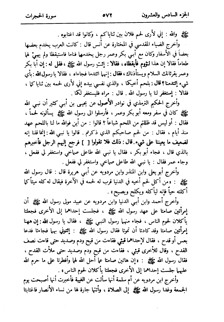 وَأخرج ابْن مرْدَوَيْه عَن أم سَلمَة أَنَّهَا سَأَلت عَن الْغَيْبَة فَأخْبرت أَنَّهَا أَصبَحت يَوْم الْجُمُعَة وَغدا رَسُول الله صلى الله عَلَيْهِ وَسلم إِلَى الصَّلَاة وأتتها جَارة لَهَا من نسَاء الْأَنْصَار فاغتابتا