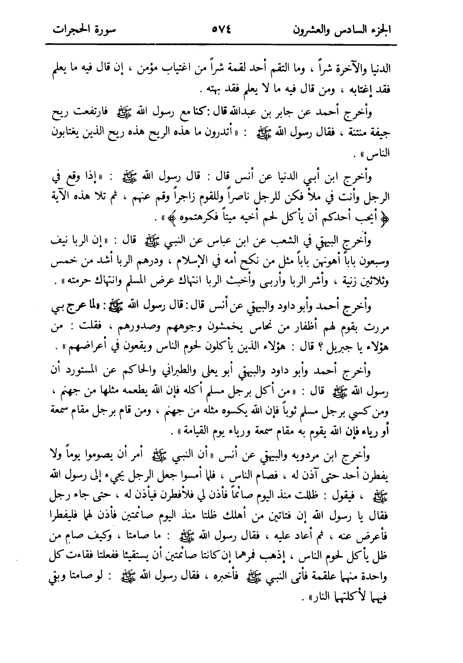 وَأخرج أَحْمد عَن جَابر بن عبد الله قَالَ: كُنَّا مَعَ رَسُول الله صلى الله عَلَيْهِ وَسلم فارتفعت ريح جيفة مُنْتِنَة فَقَالَ رَسُول الله صلى الله عَلَيْهِ وَسلم: أَتَدْرُونَ مَا هَذِه الرّيح هَذِه ريح الَّذين يغتابون النَّاس