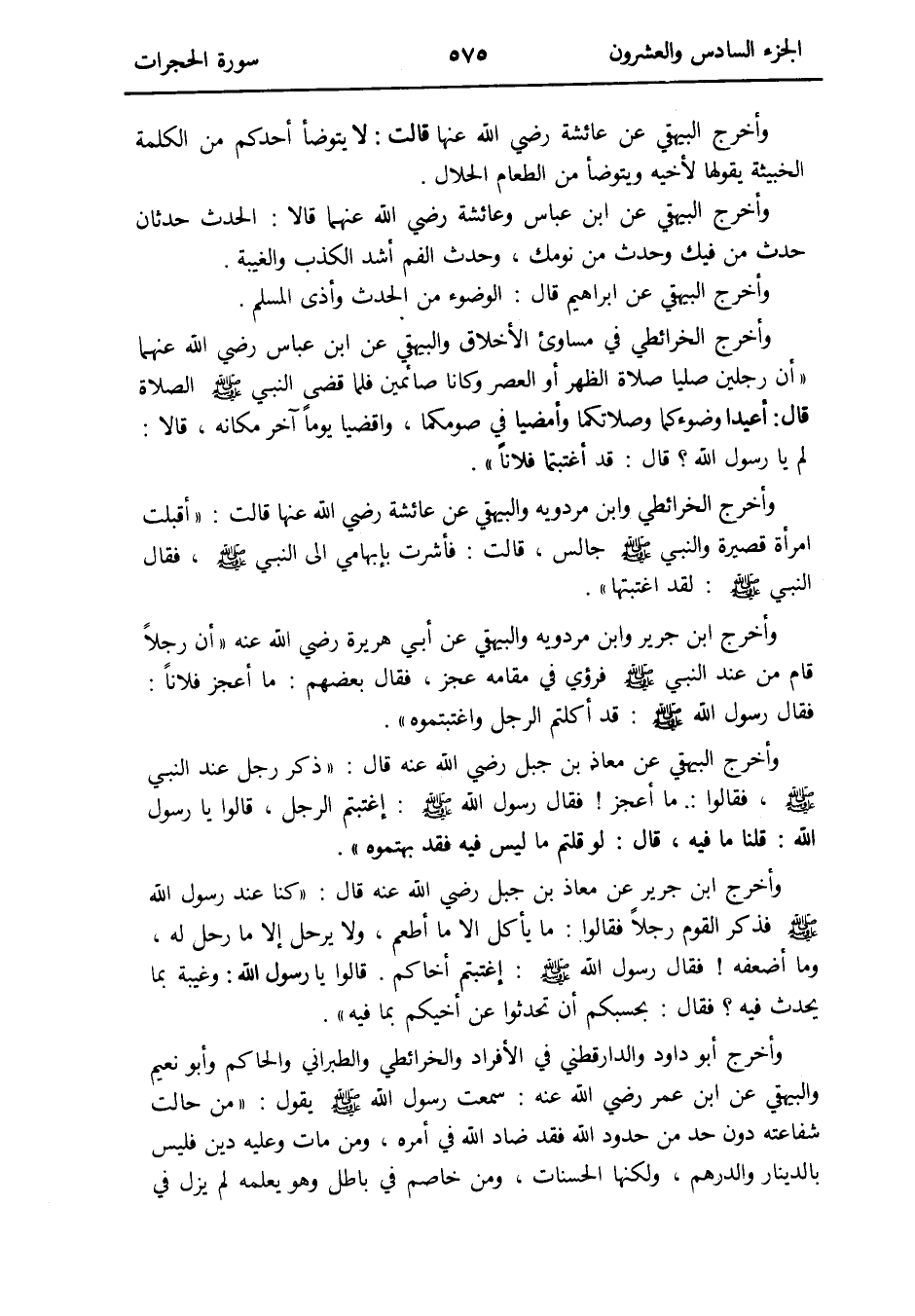 وَأخرج الْبَيْهَقِيّ عَن عَائِشَة رَضِي الله عَنْهَا قَالَت: لَا يتَوَضَّأ أحدكُم من الْكَلِمَة الخبيثة يَقُولهَا لِأَخِيهِ وَيتَوَضَّأ من الطَّعَام الْحَلَال