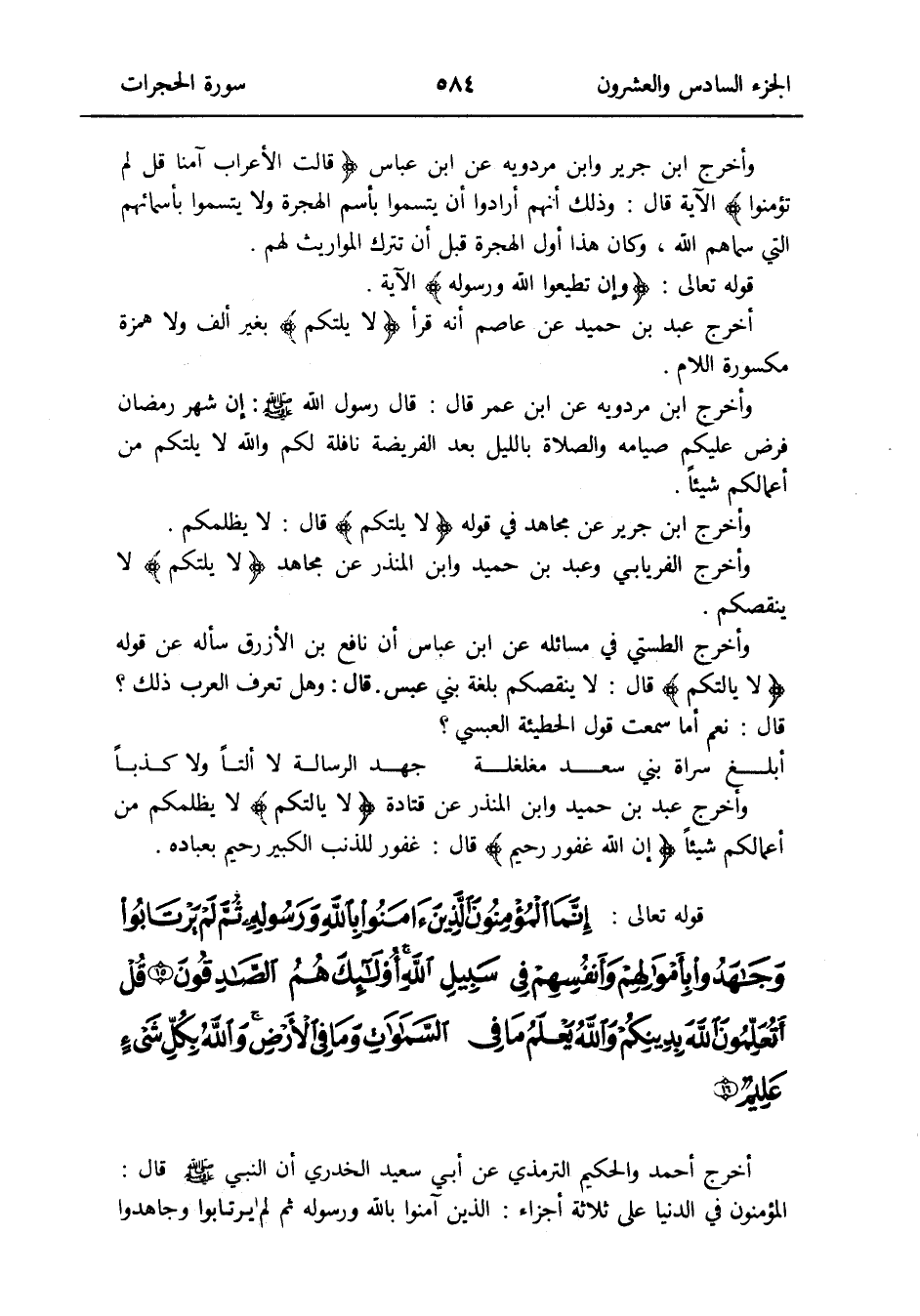 وَأخرج ابْن جرير وَابْن مرْدَوَيْه عَن ابْن عَبَّاس {قَالَت الْأَعْرَاب آمنا قل لم تؤمنوا} الْآيَة قَالَ: وَذَلِكَ أَنهم أَرَادوا أَن يتسموا باسم الْهِجْرَة وَلَا يتسموا بِأَسْمَائِهِمْ الَّتِي سماهم الله وَكَانَ هَذَا أول الْهِجْرَة قبل أَن تتْرك الْمَوَارِيث لَهُم