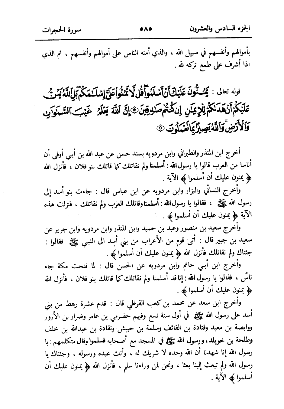 وَأخرج سعيد بن مَنْصُور وَعبد بن حميد وَابْن الْمُنْذر وَابْن مرْدَوَيْه وَابْن جرير عَن سعيد بن جُبَير قَالَ: أَتَى قوم من الْأَعْرَاب من بني أَسد إِلَى النَّبِي صلى الله عَلَيْهِ وَسلم قَالُوا: جئْنَاك وَلم نقاتلك فَأنْزل الله {يمنون عَلَيْك أَن أَسْلمُوا}