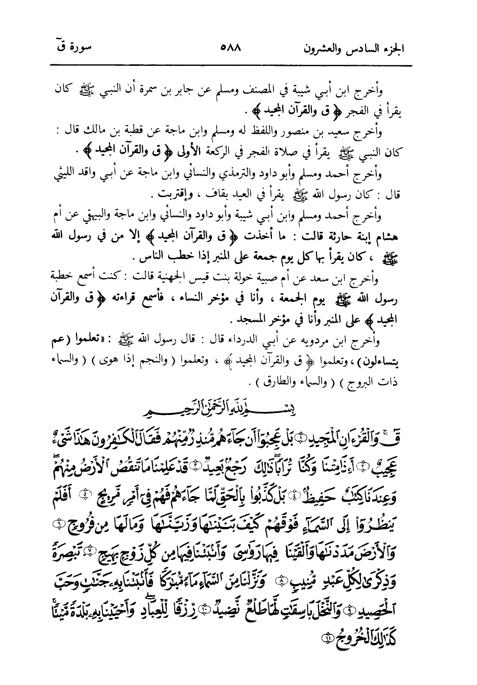 وَأخرج أَحْمد وَمُسلم وَابْن أبي شيبَة وَأَبُو دَاوُد وَالنَّسَائِيّ وَابْن ماجة وَالْبَيْهَقِيّ عَن أم هِشَام ابْنة حَارِثَة قَالَت: مَا أخذت {ق وَالْقُرْآن الْمجِيد} إِلَّا من فِي رَسُول الله صلى الله عَلَيْهِ وَسلم كَانَ يقْرَأ بهَا كل يَوْم جُمُعَة على الْمِنْبَر إِذا خطب النَّاس