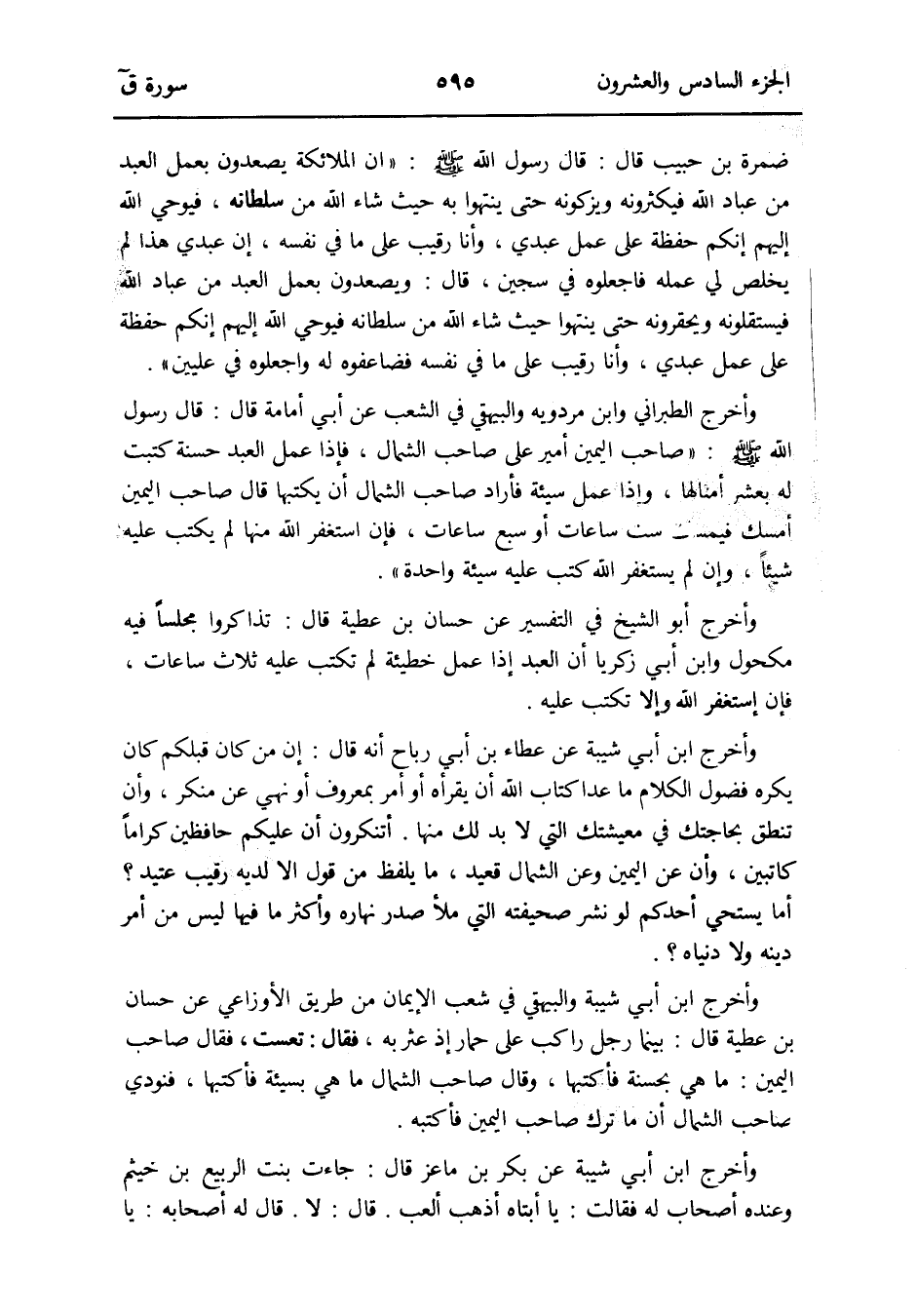 ضَمرَة بن حبيب قَالَ: قَالَ رَسُول الله صلى الله عَلَيْهِ وَسلم: إِن الْمَلَائِكَة يصعدون بِعَمَل العَبْد من عباد الله فيكثرونه ويزكونه حَتَّى ينْتَهوا بِهِ حَيْثُ شَاءَ الله من سُلْطَانه فَيُوحِي الله إِلَيْهِم إِنَّكُم حفظَة على عمل عَبدِي وَأَنا رَقِيب على مَا فِي نَفسه إِن عَبدِي هَذَا لم يخلص لي عمله فَاجْعَلُوهُ فِي سِجِّين قَالَ: ويصعدون بِعَمَل العَبْد من عباد الله فيستقلونه ويحقرونه حَتَّى ينْتَهوا حَيْثُ شَاءَ الله من سُلْطَانه فَيُوحِي الله إِلَيْهِم إِنَّكُم حفظَة على عمل عَبدِي وَأَنا رَقِيب على مَا فِي نَفسه فضاعفوه لَهُ واجعلوه فِي عليين