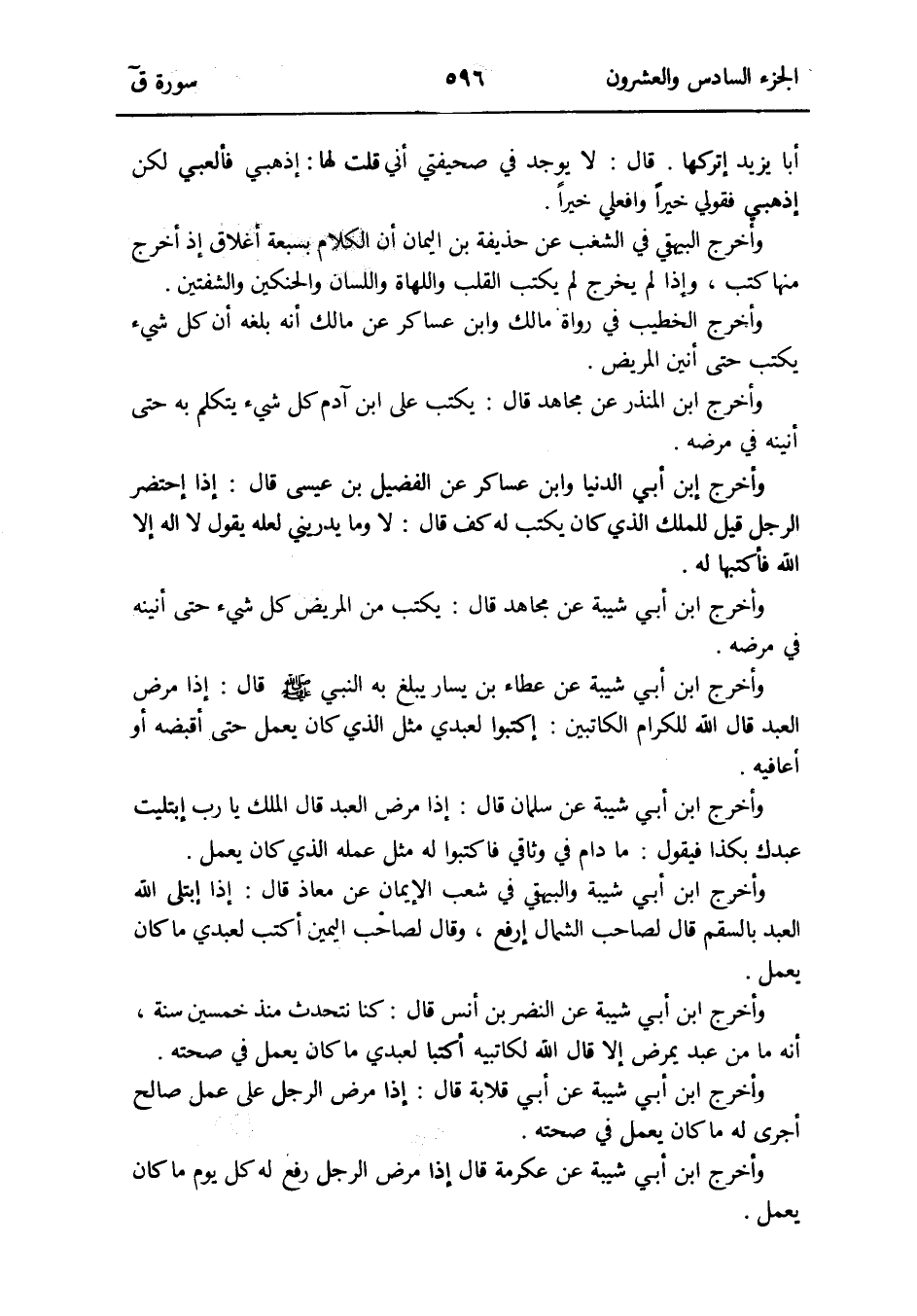 وَأخرج ابْن أبي الدُّنْيَا وَابْن عَسَاكِر عَن الفضيل بن عِيسَى قَالَ: إِذا احْتضرَ الرجل قيل للْملك الَّذِي كَانَ يكْتب لَهُ كف قَالَ: لَا وَمَا يدريني لَعَلَّه يَقُول لَا إِلَه إِلَّا الله فأكتبها لَهُ