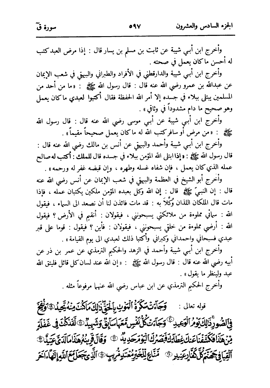 وَأخرج ابْن أبي شيبَة وَالدَّارَقُطْنِيّ فِي الْأَفْرَاد وَالطَّبَرَانِيّ وَالْبَيْهَقِيّ فِي شعب الإِيمان عَن عبد الله بن عَمْرو رَضِي الله عَنهُ قَالَ: قَالَ رَسُول الله صلى الله عَلَيْهِ وَسلم: مَا من أحد من الْمُسلمين يبتلى ببلاء فِي جسده إِلَّا أَمر الله الْحفظَة فَقَالَ أكتبوا لعبدي مَا كَانَ يعْمل وَهُوَ صَحِيح مَا دَامَ مشدوداً فِي وثاقي