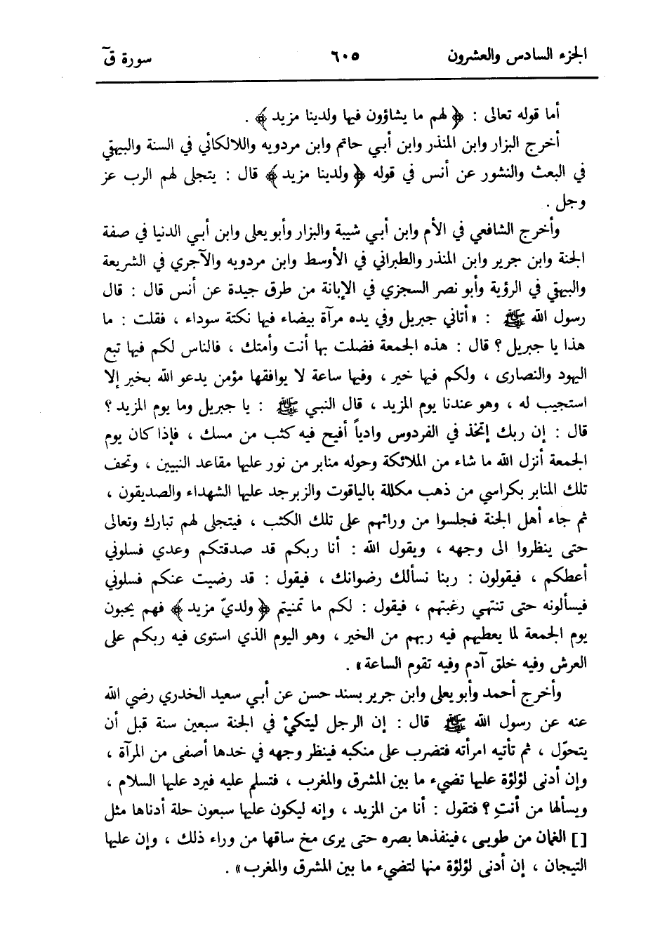 أخرج الْبَزَّار وَابْن الْمُنْذر وَابْن أبي حَاتِم وَابْن مرْدَوَيْه واللالكائي فِي السّنة وَالْبَيْهَقِيّ فِي الْبَعْث والنشور عَن أنس فِي قَوْله {ولدينا مزِيد} قَالَ: يتجلى لَهُم الرب عز وَجل