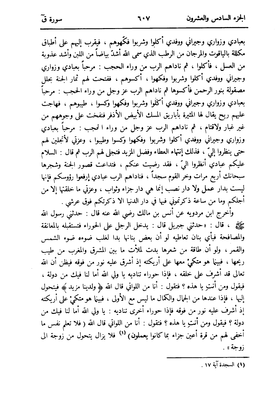 وَأخرج ابْن مرْدَوَيْه عَن أنس بن مَالك رَضِي الله عَنهُ قَالَ: حَدثنِي رَسُول الله صلى الله عَلَيْهِ وَسلم قَالَ: حَدثنِي جِبْرِيل قَالَ: يدْخل الرجل على الْحَوْرَاء فتستقبله بالمعانقة والمصافحة فَبِأَي بنان تعاطيه لَو أَن بعض بنانها بدا لغلب ضوءه ضوء الشَّمْس وَالْقَمَر وَلَو أَن طَاقَة من شعرهَا بَدَت لملأت مَا بَين الْمشرق وَالْمغْرب من طيب رِيحهَا فَبَيْنَمَا هُوَ متكىء مَعهَا على أريكته إِذْ أشرق عَلَيْهِ نور من فَوْقه فيظن أَن الله تَعَالَى قد أشرف على خلقه فَإِذا حوراء تناديه يَا ولي الله أما لنا فِيك من دولة فَيَقُول وَمن أنتِ يَا هَذِه فَتَقول: أَنا من اللواتي قَالَ الله {ولدينا مزِيد} فيتحول إِلَيْهَا فَإِذا عِنْدهَا من الْجمال والكمال مَا لَيْسَ مَعَ الأولى فَبَيْنَمَا هُوَ متكىء على أريكته إِذْ أشرف عَلَيْهِ نور من فَوْقه فَإِذا حوراء أُخْرَى تناديه: يَا ولي الله أما لنا فِيك من دولة فَيَقُول وَمن أنتِ يَا هَذِه فَتَقول: أَنا من اللواتي قَالَ الله (فَلَا تعلم نفس مَا أُخْفِي لَهُم من قُرَّة أعين جَزَاء بِمَا كَانُوا يعْملُونَ) (السَّجْدَة آيَة 17) فَلَا يزَال يتَحَوَّل من زَوْجَة إِلَى زَوْجَة
