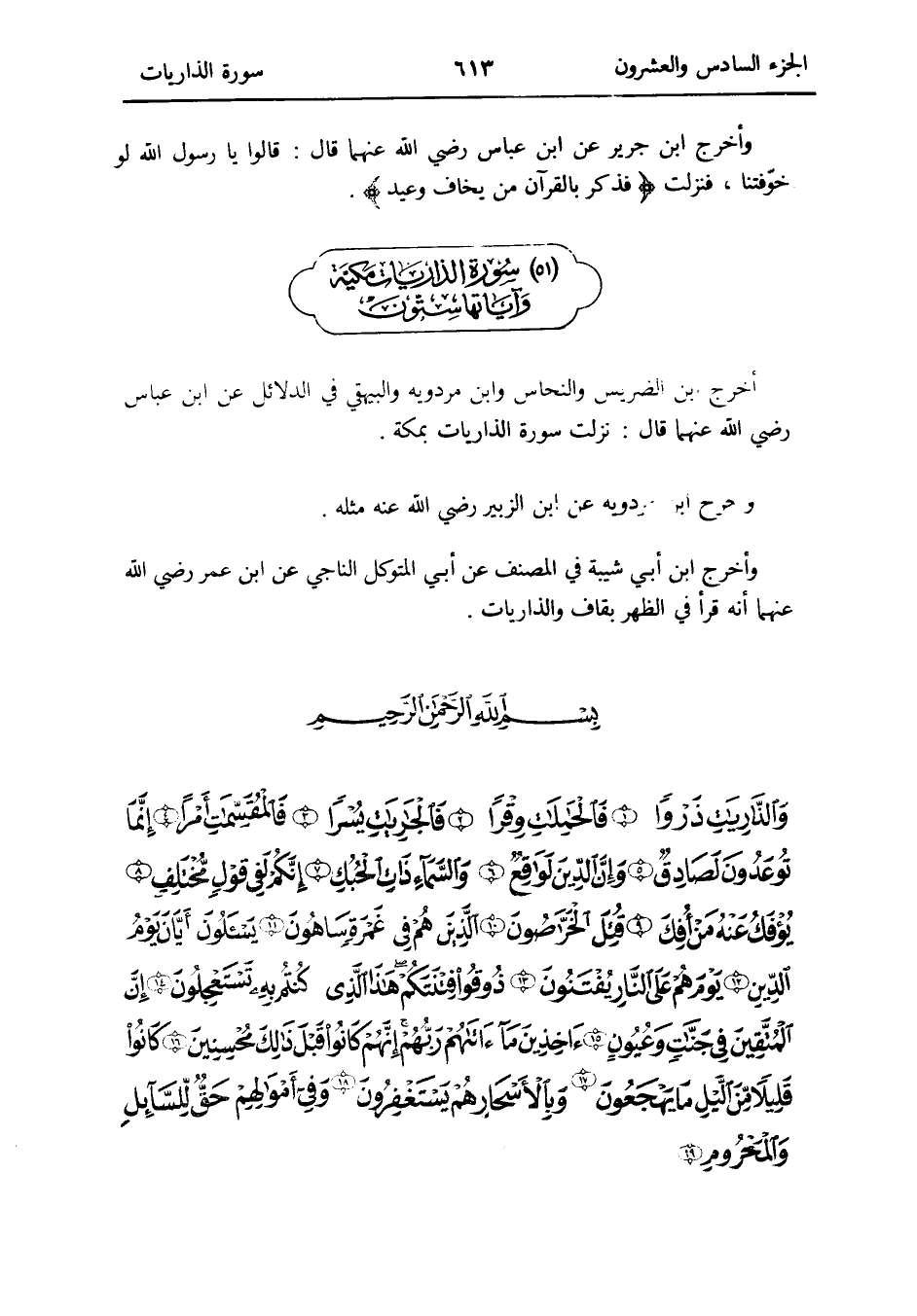 مُقَدّمَة سُورَة الذاريات أخرج ابْن الضريس والنحاس وَابْن مرْدَوَيْه وَالْبَيْهَقِيّ فِي الدَّلَائِل عَن ابْن عَبَّاس رَضِي الله عَنْهُمَا قَالَ: نزلت سُورَة الذاريات بِمَكَّة