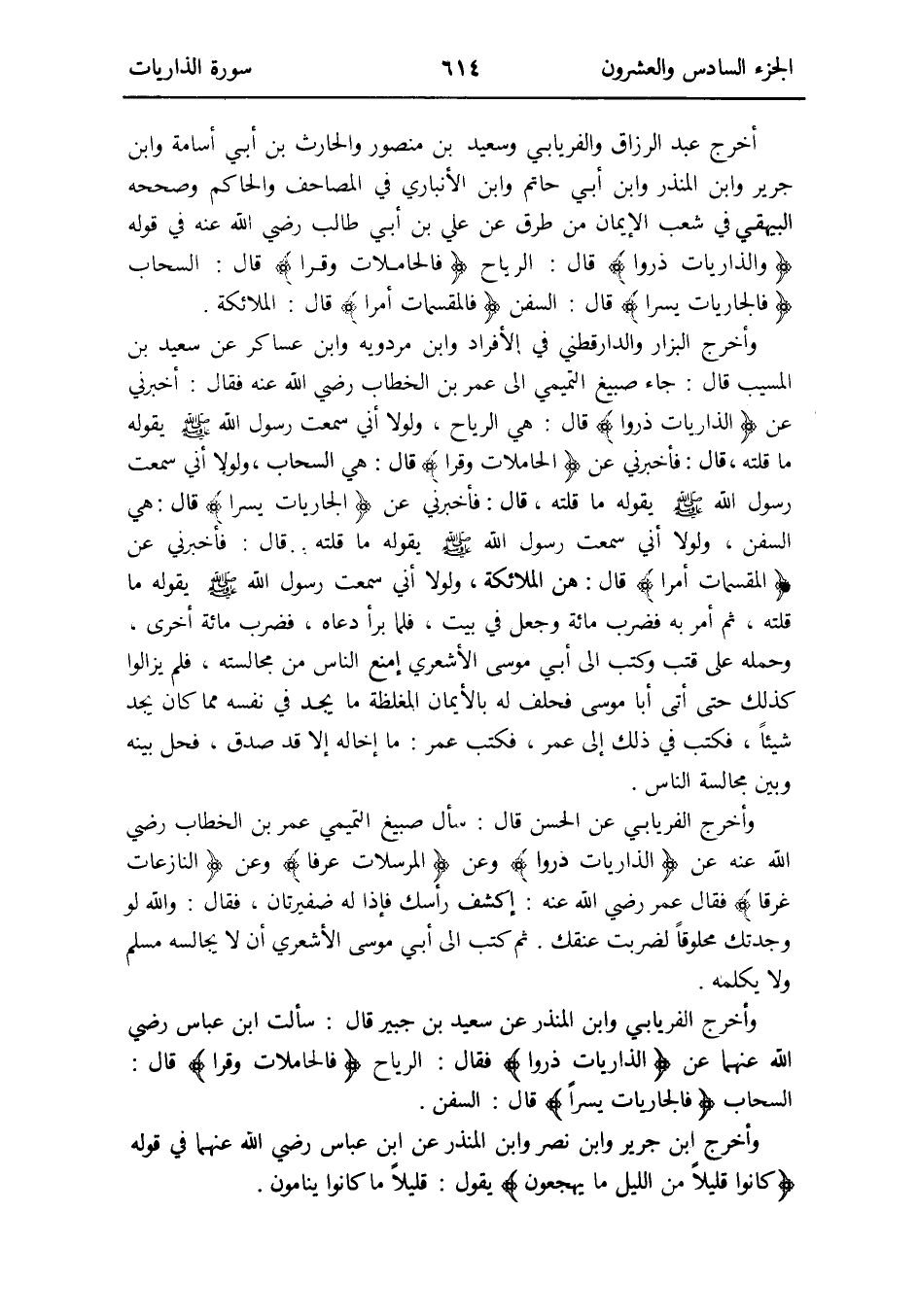 أخرج عبد الرَّزَّاق وَالْفِرْيَابِي وَسَعِيد بن مَنْصُور والْحَارث بن أبي أُسَامَة وَابْن جرير وَابْن الْمُنْذر وَابْن أبي حَاتِم وَابْن الْأَنْبَارِي فِي الْمَصَاحِف وَالْحَاكِم وَصَححهُ الْبَيْهَقِيّ فِي شعب الإِيمان من طرق عَن عَليّ بن أبي طَالب رَضِي الله عَنهُ فِي قَوْله {والذاريات ذَروا} قَالَ: الرِّيَاح {فَالْحَامِلَات وقرا} قَالَ: السَّحَاب {فَالْجَارِيَات يسرا} قَالَ: السفن {فَالْمُقَسِّمَات أمرا} قَالَ: الْمَلَائِكَة