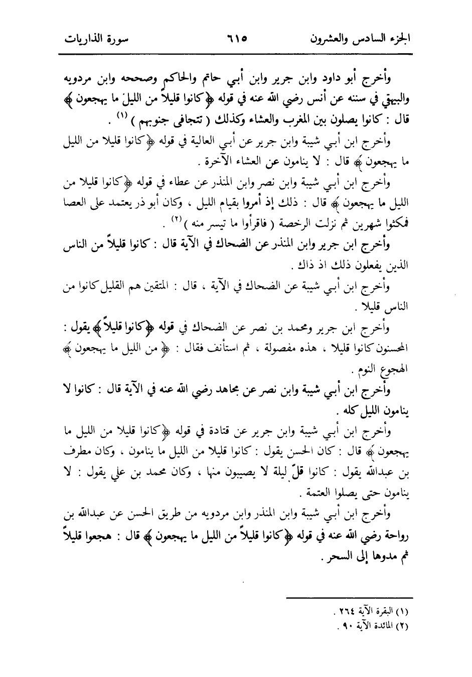وَأخرج أَبُو دَاوُد وَابْن جرير وَابْن أبي حَاتِم وَالْحَاكِم وَصَححهُ وَابْن مرْدَوَيْه وَالْبَيْهَقِيّ فِي سنَنه عَن أنس رَضِي الله عَنهُ فِي قَوْله {كَانُوا قَلِيلا من اللَّيْل مَا يهجعون} قَالَ: كَانُوا يصلونَ بَين الْمغرب وَالْعشَاء وَكَذَلِكَ (تَتَجَافَى جنُوبهم) (الْبَقَرَة الْآيَة 264)