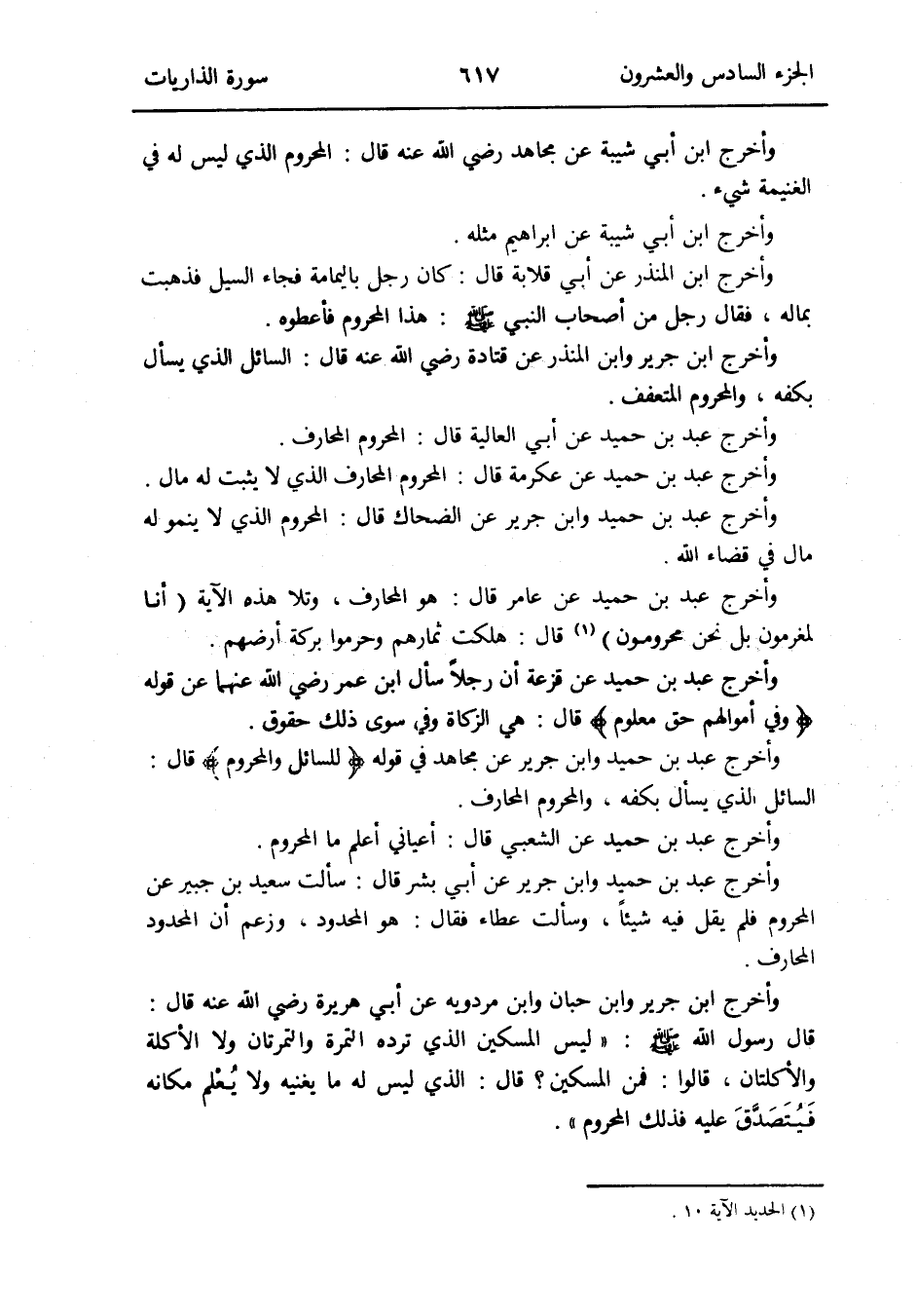 وَأخرج عبد بن حميد وَابْن جرير عَن مُجَاهِد فِي قَوْله {للسَّائِل والمحروم} قَالَ: السَّائِل الَّذِي يسْأَل بكفه والمحروم المحارف