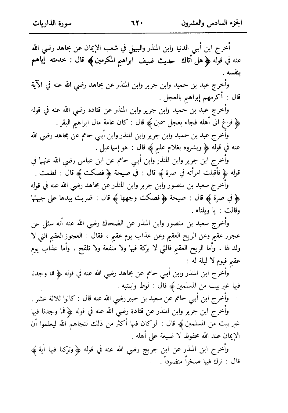 وَأخرج ابْن جرير وَابْن الْمُنْذر وَابْن أبي حَاتِم عَن ابْن عَبَّاس رَضِي الله عَنْهُمَا فِي قَوْله {فَأَقْبَلت امْرَأَته فِي صرة} قَالَ: فِي صَيْحَة {فصكت} قَالَ: لطمت