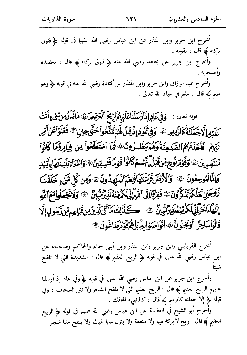 وَأخرج ابْن جرير عَن ابْن عَبَّاس رَضِي الله عَنْهُمَا فِي قَوْله {وَفِي عَاد إِذْ أرسلنَا عَلَيْهِم الرّيح الْعَقِيم} قَالَ: الرّيح الْعَقِيم الَّتِي لَا تلقح الشّجر وَلَا تثير السَّحَاب وَفِي قَوْله {إِلَّا جعلته كالرميم} قَالَ: كالشيء الْهَالِك