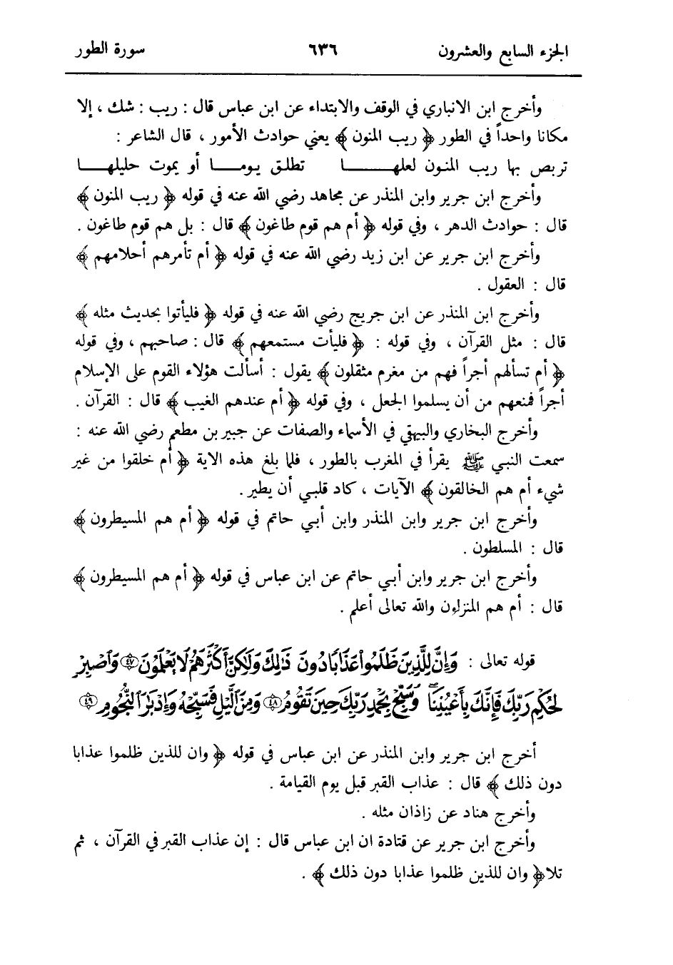 وَأخرج ابْن الْأَنْبَارِي فِي الْوَقْت والابتداء عَن ابْن عَبَّاس قَالَ: ريب: شكّ إِلَّا مَكَانا وَاحِدًا فِي الطّور {ريب الْمنون} يَعْنِي حوادث الْأُمُور قَالَ الشَّاعِر: تربص بهَا ريب الْمنون لَعَلَّهَا تطلق يَوْمًا أَو يَمُوت حَلِيلهَا وَأخرج ابْن جرير وَابْن الْمُنْذر عَن مُجَاهِد رَضِي الله عَنهُ فِي قَوْله {ريب الْمنون} قَالَ: حوادث الدَّهْر وَفِي قَوْله {أم هم قوم طاغون} قَالَ: بل هم قوم طاغون