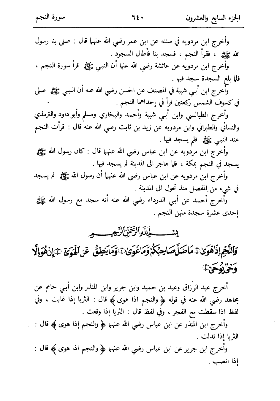 وَأخرج ابْن مرْدَوَيْه عَن ابْن عَبَّاس رَضِي الله عَنْهُمَا قَالَ: كَانَ رَسُول الله صلى الله عَلَيْهِ وَسلم يسْجد فِي النَّجْم بِمَكَّة فَلَمَّا هَاجر إِلَى الْمَدِينَة لم يسْجد فِيهَا