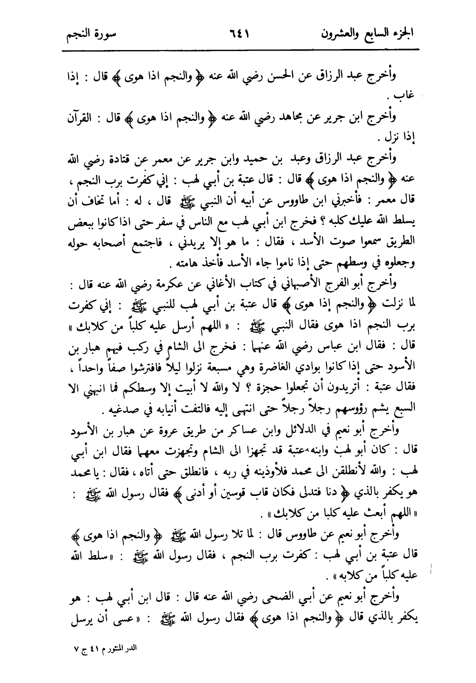 وَأخرج عبد الرَّزَّاق وَعبد بن حميد وَابْن جرير عَن معمر عَن قَتَادَة رَضِي الله عَنهُ {والنجم إِذا هوى} قَالَ: قَالَ عتبَة بن أبي لَهب: إِنِّي كفرت بِرَبّ النَّجْم قَالَ معمر: فَأَخْبرنِي ابْن طَاوُوس عَن أَبِيه أَن النَّبِي صلى الله عَلَيْهِ وَسلم قَالَ لَهُ: أما تخَاف أَن يُسَلط الله عَلَيْك كَلْبه فَخرج ابْن أبي لَهب مَعَ النَّاس فِي سفر حَتَّى إِذا كَانُوا بِبَعْض الطَّرِيق سمعُوا صَوت الْأسد فَقَالَ: مَا هُوَ إِلَّا يُرِيدنِي فَاجْتمع أَصْحَابه حوله وجعلوه فِي وَسطهمْ حَتَّى إِذا نَامُوا جَاءَ الْأسد فَأخذ هامته