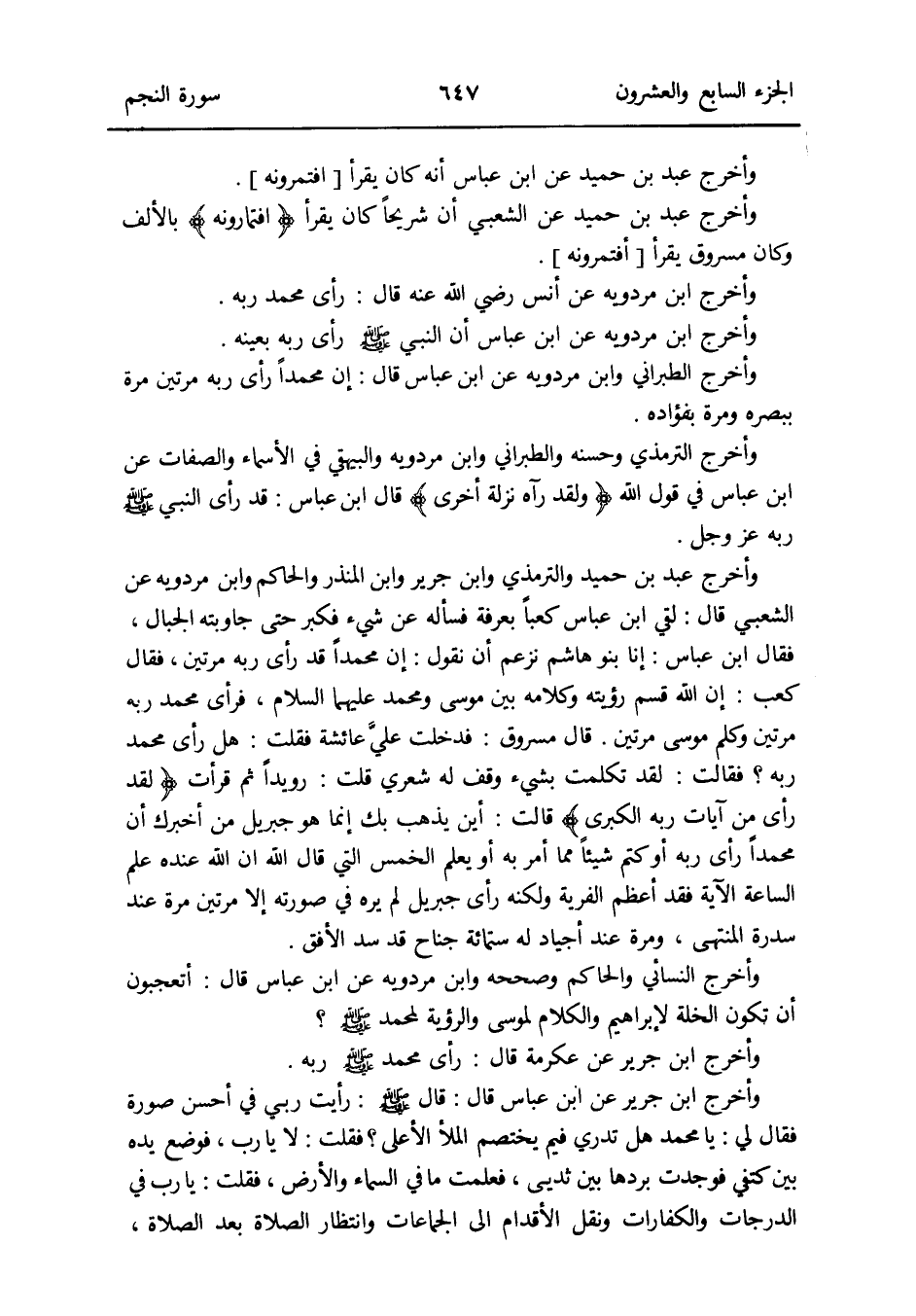 وَأخرج عبد بن حميد وَالتِّرْمِذِيّ وَابْن جرير وَابْن الْمُنْذر وَالْحَاكِم وَابْن مرْدَوَيْه عَن الشّعبِيّ قَالَ: لَقِي ابْن عَبَّاس كَعْبًا بِعَرَفَة فَسَأَلَهُ عَن شَيْء فَكبر حَتَّى جاوبته الْجبَال فَقَالَ ابْن عَبَّاس: إِنَّا بَنو هَاشم نزعم أَن نقُول: إِن مُحَمَّدًا قد رأى ربه مرَّتَيْنِ فَقَالَ كَعْب: إِن الله قسم رُؤْيَته وَكَلَامه بَين مُوسَى وَمُحَمّد عَلَيْهِمَا السَّلَام فَرَأى مُحَمَّد ربه مرَّتَيْنِ وكلم مُوسَى مرَّتَيْنِ