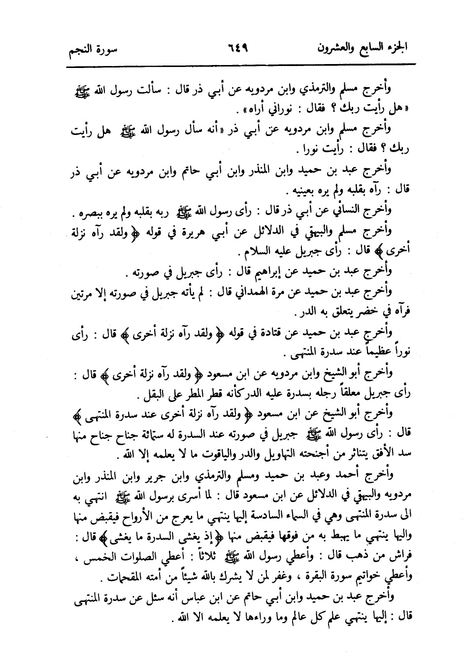 وَأخرج مُسلم وَالتِّرْمِذِيّ وَابْن مرْدَوَيْه عَن أبي ذَر قَالَ: سَأَلت رَسُول الله صلى الله عَلَيْهِ وَسلم هَل رَأَيْت رَبك فَقَالَ: نور أَنى أرَاهُ