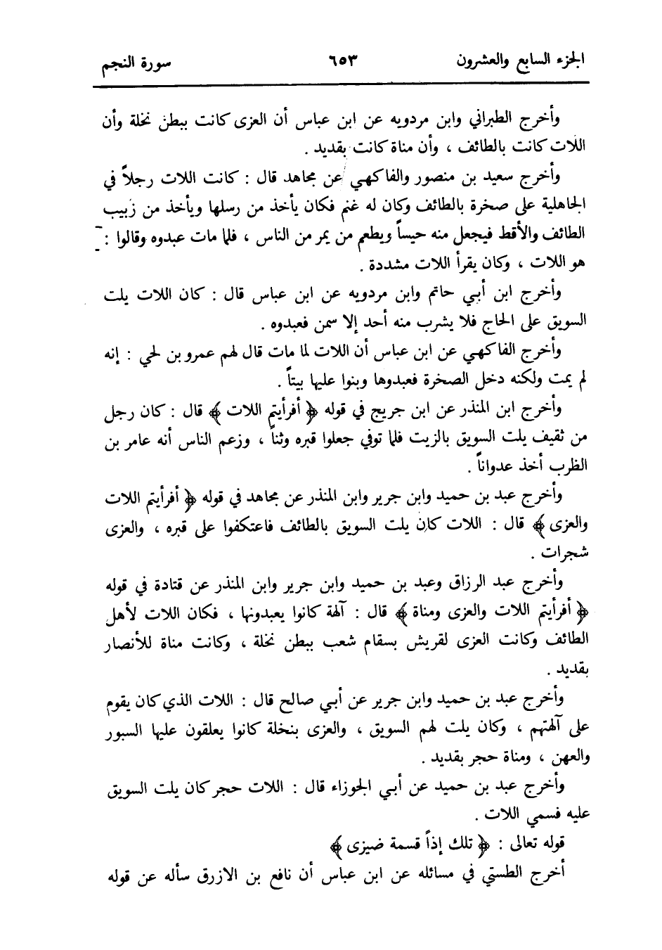 وَأخرج الطَّبَرَانِيّ وَابْن مرْدَوَيْه عَن ابْن عَبَّاس أَن الْعُزَّى كَانَت بِبَطن نَخْلَة وَأَن اللات كَانَت بِالطَّائِف وَأَن مَنَاة كَانَت بِقديد