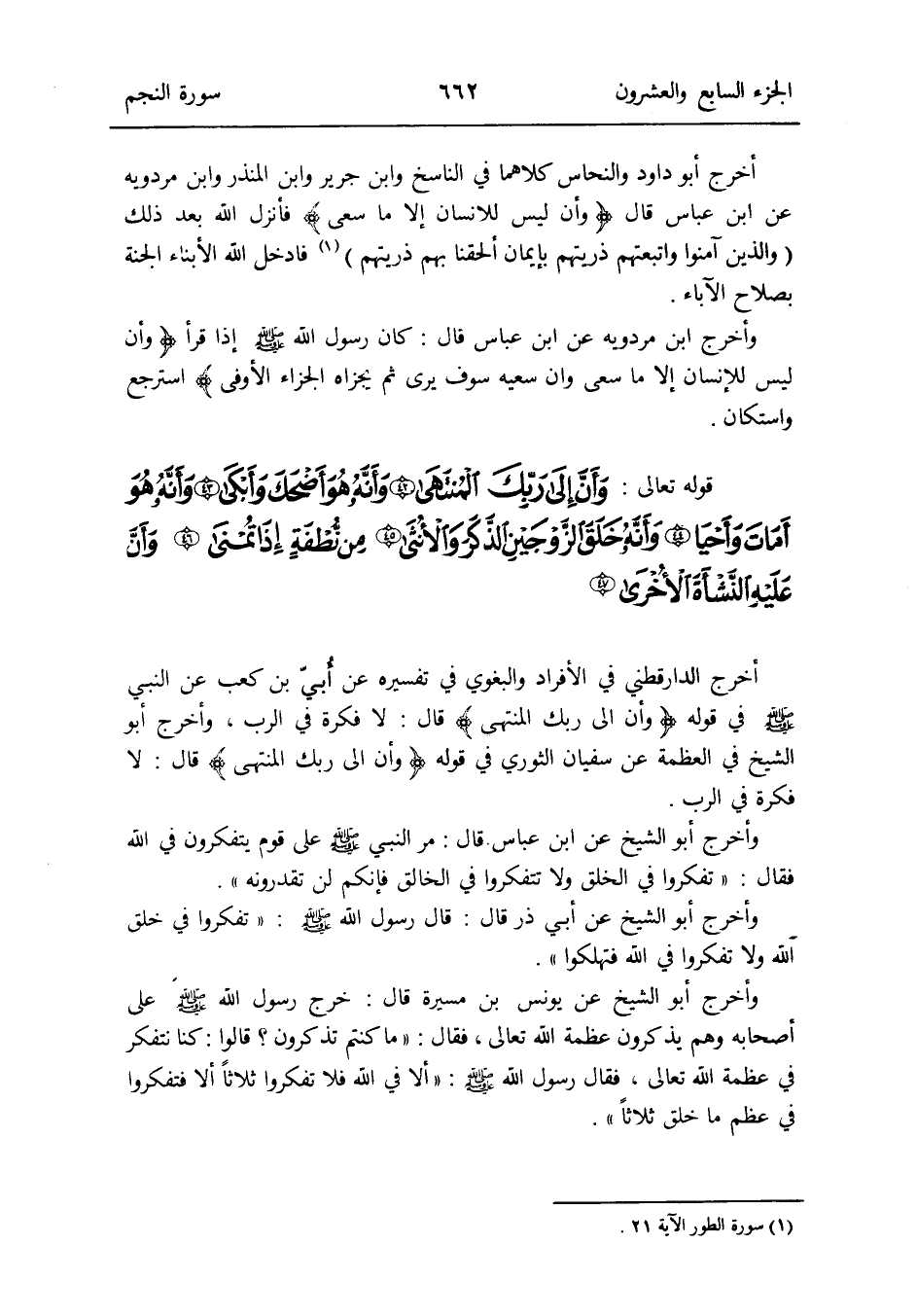 أخرج الدَّارَقُطْنِيّ فِي الْأَفْرَاد وَالْبَغوِيّ فِي تَفْسِيره عَن أُبيّ بن كَعْب عَن النَّبِي صلى الله عَلَيْهِ وَسلم فِي قَوْله {وَأَن إِلَى رَبك الْمُنْتَهى} قَالَ: لَا فكرة فِي الرب وَأخرج أَبُو الشَّيْخ فِي العظمة عَن سُفْيَان الثَّوْريّ فِي قَوْله {وَأَن إِلَى رَبك الْمُنْتَهى} قَالَ: لَا فكرة فِي الرب