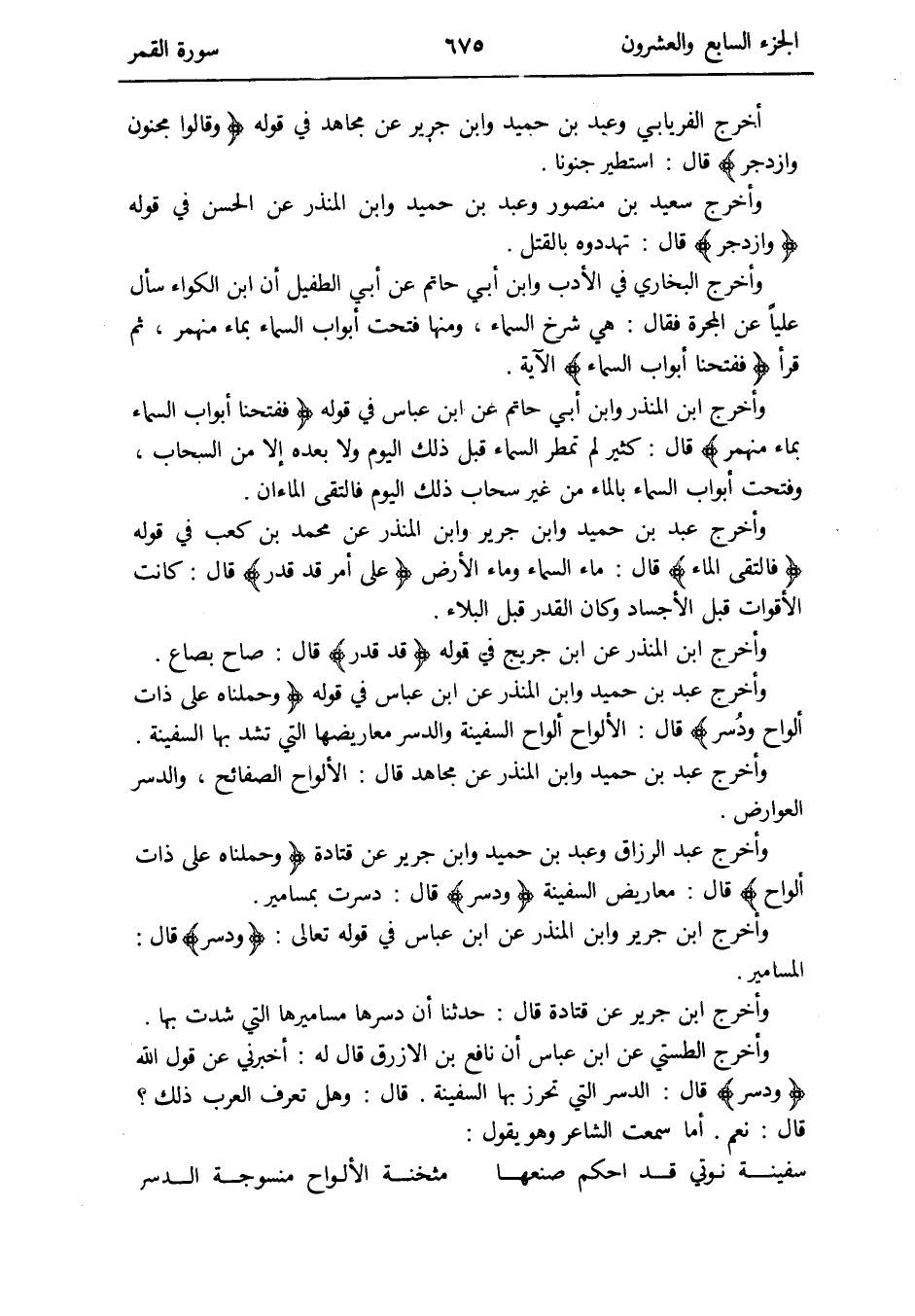 وَأخرج الطستي عَن ابْن عَبَّاس إِن نَافِع بن الْأَزْرَق قَالَ لَهُ: أَخْبرنِي عَن قَول الله {ودسر} قَالَ: الدسر الَّتِي تحرز بهَا السَّفِينَة