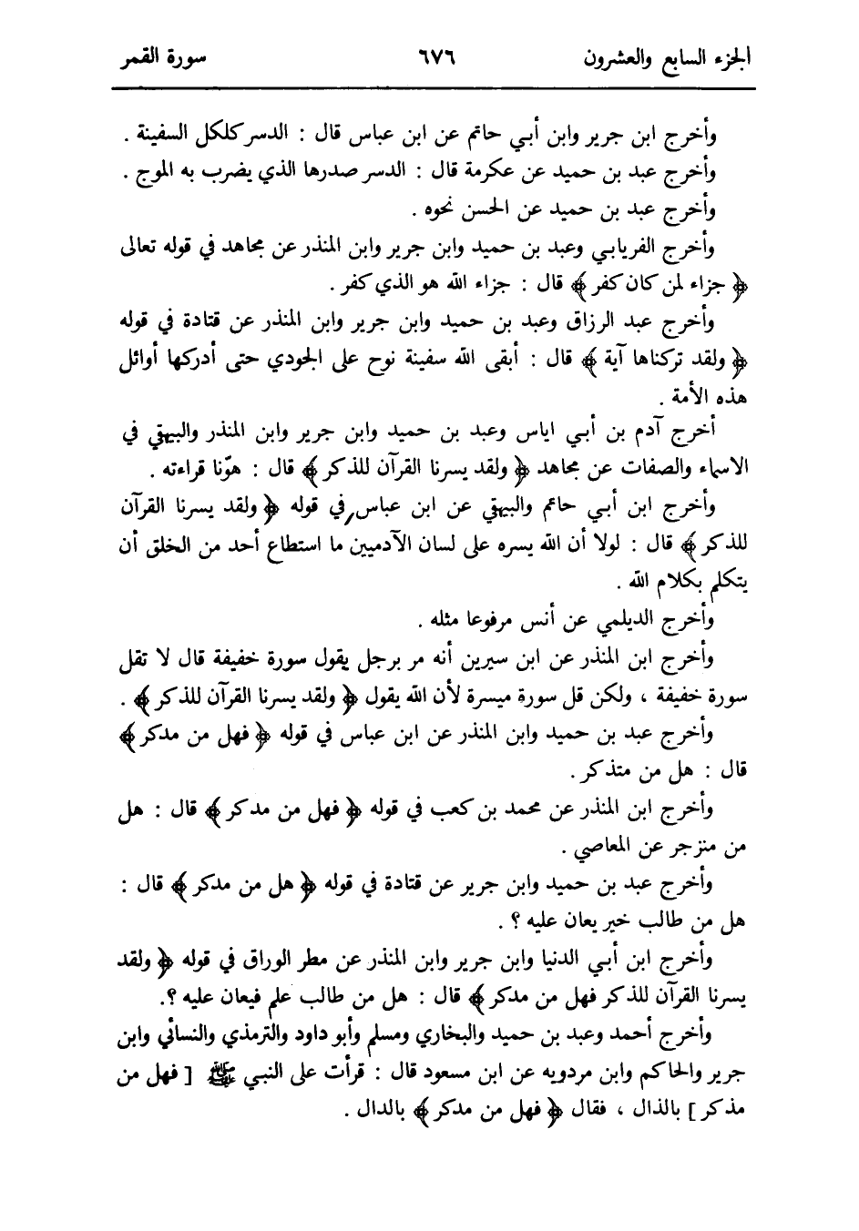 وَأخرج عبد بن حميد وَابْن جرير عَن قَتَادَة فِي قَوْله {فَهَل من مدكر} قَالَ: هَل من طَالب خير يعان عَلَيْهِ وَأخرج ابْن أبي الدُّنْيَا وَابْن جرير وَابْن الْمُنْذر عَن مطر الْوراق فِي قَوْله {وَلَقَد يسرنَا الْقُرْآن للذّكر فَهَل من مدكر} قَالَ: هَل من طَالب علم فيعان عَلَيْهِ