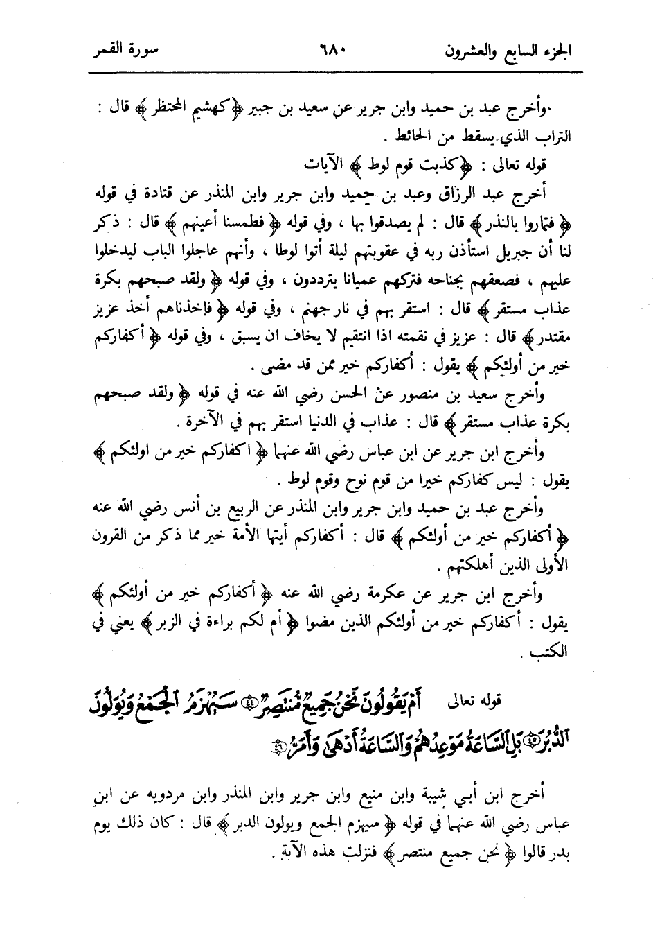 أخرج عبد الرَّزَّاق وَعبد بن حميد وَابْن جرير وَابْن الْمُنْذر عَن قَتَادَة فِي قَوْله {فتماروا بِالنذرِ} قَالَ: لم يصدقُوا بهَا وَفِي قَوْله {فطمسنا أَعينهم} قَالَ: ذكر لنا أَن جِبْرِيل اسْتَأْذن ربه فِي عقوبتهم لَيْلَة أَتَوا لوطاً وَأَنَّهُمْ عاجلوا الْبَاب ليدخلوا عَلَيْهِم فصعقهم بجناحه فتركهم عمياناً يَتَرَدَّدُونَ وَفِي قَوْله {وَلَقَد صبحهمْ بكرَة عَذَاب مُسْتَقر} قَالَ: اسْتَقر بهم فِي نَار جَهَنَّم وَفِي قَوْله {فأخذناهم أَخذ عَزِيز مقتدر} قَالَ: عَزِيز فِي نقمته إِذا انتقم لَا يخَاف أَن يسْبق وَفِي قَوْله {أكفاركم خير من أولئكم} يَقُول: أكفاركم خير مِمَّن قد مضى
