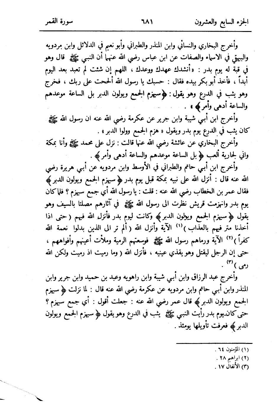 وَأخرج ابْن أبي حَاتِم وَالطَّبَرَانِيّ فِي الْأَوْسَط وَابْن مرْدَوَيْه عَن أبي هُرَيْرَة رَضِي الله عَنهُ قَالَ: أنزل الله على نبيه بِمَكَّة قبل يَوْم بدر {سَيهْزمُ الْجمع وَيُوَلُّونَ الدبر} فَقَالَ عمر بن الْخطاب رَضِي الله عَنهُ: قلت: يَا رَسُول الله أَي جمع سَيهْزمُ فَلَمَّا كَانَ يَوْم بدر وانهزمت قُرَيْش نظرت إِلَى رَسُول الله صلى الله عَلَيْهِ وَسلم فِي آثَارهم مُصْلِتًا بِالسَّيْفِ وَهُوَ يَقُول {سَيهْزمُ الْجمع وَيُوَلُّونَ الدبر} وَكَانَت ليَوْم بدر فَأنْزل الله فيهم (حَتَّى إِذا أَخذنَا مترفيهم بِالْعَذَابِ) (الْمُؤْمِنُونَ 64) الْآيَة وَأنزل الله (ألم تَرَ إِلَى الَّذين بدلُوا نعْمَة الله كفرا) (إِبْرَاهِيم 28) الْآيَة وَرَمَاهُمْ رَسُول الله صلى الله عَلَيْهِ وَسلم فوسعتهم الرَّمية وملأت أَعينهم وأفواههم حَتَّى إِن الرجل ليقْتل وَهُوَ يقذي عَيْنَيْهِ فَأنْزل الله (وَمَا رميت إِذْ رميت وَلَكِن الله رمى) (الْأَنْفَال 17)
