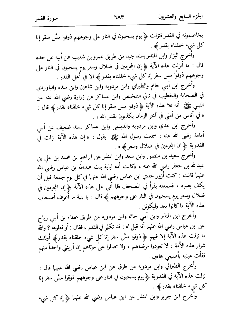 وَأخرج الطَّبَرَانِيّ وَابْن مرْدَوَيْه من طرق عَن ابْن عَبَّاس رَضِي الله عَنْهُمَا قَالَ: نزلت هَذِه الْآيَة فِي الْقَدَرِيَّة {يَوْم يسْحَبُونَ فِي النَّار على وُجُوههم ذوقوا مس سقر إِنَّا كل شَيْء خلقناه بِقدر}