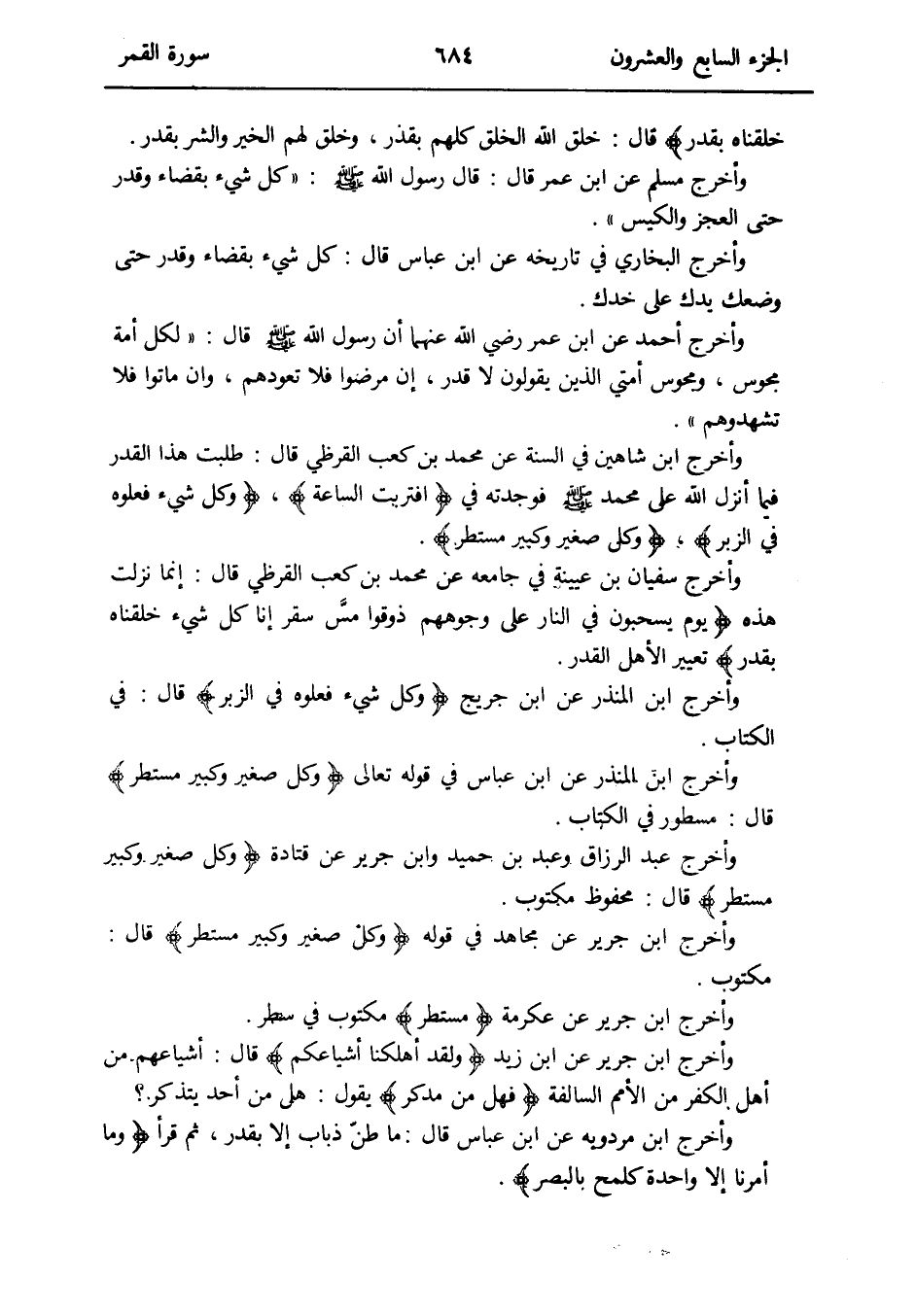 وَأخرج ابْن شاهين فِي السّنة عَن مُحَمَّد بن كَعْب الْقرظِيّ قَالَ: طلبت هَذَا الْقدر فِيمَا أنزل الله على مُحَمَّد صلى الله عَلَيْهِ وَسلم فَوَجَدته فِي {اقْتَرَبت السَّاعَة} {وكل شَيْء فَعَلُوهُ فِي الزبر} {وكل صَغِير وكبير مستطر}