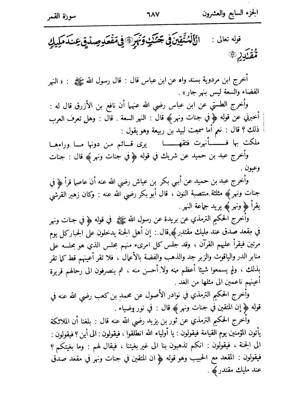 وَأخرج الْحَكِيم التِّرْمِذِيّ فِي نَوَادِر الْأُصُول عَن مُحَمَّد بن كَعْب رَضِي الله عَنهُ فِي قَوْله {إِن الْمُتَّقِينَ فِي جنَّات ونهر} قَالَ: فِي نور وضياء