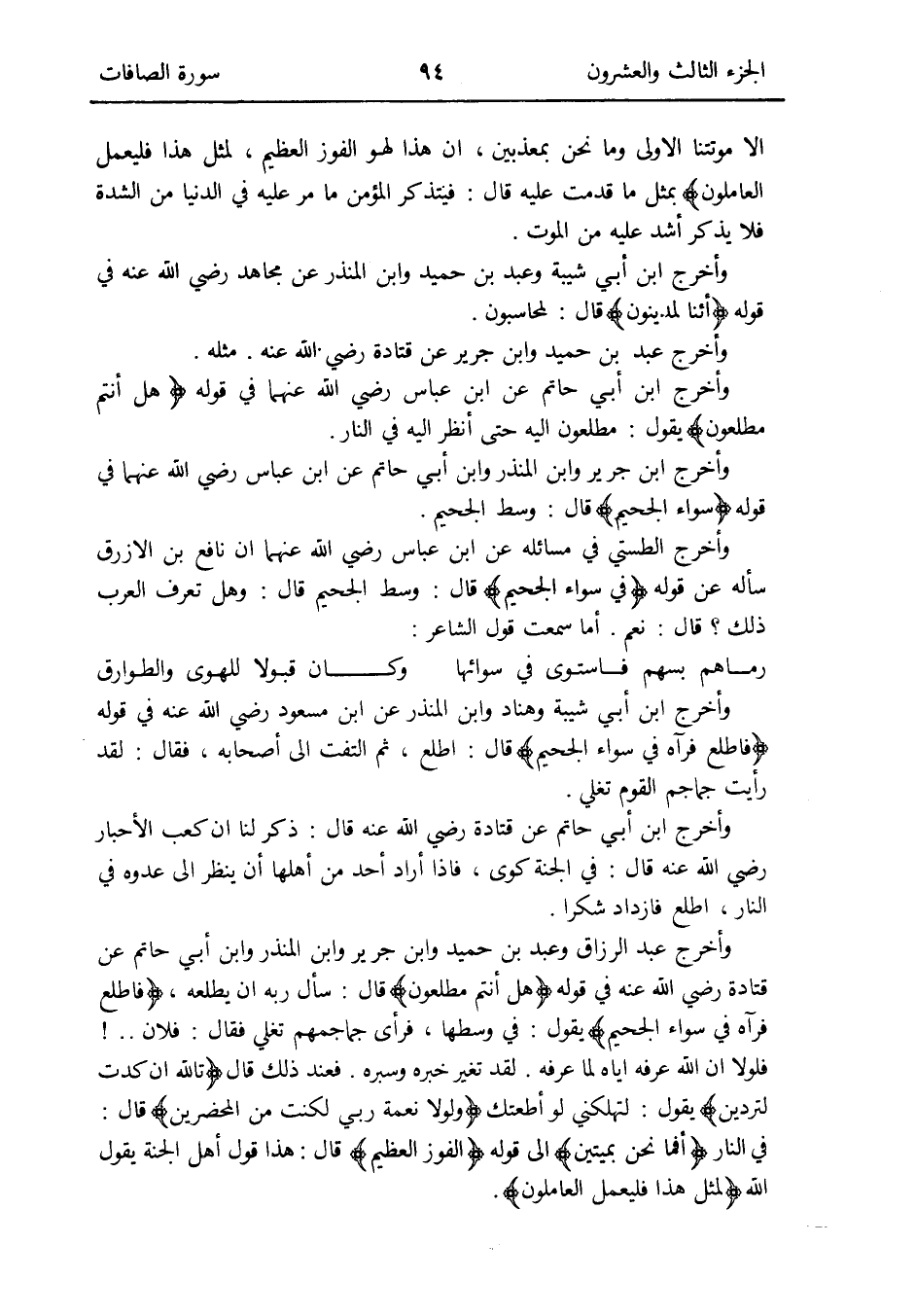 وَأخرج عبد الرَّزَّاق وَعبد بن حميد وَابْن جرير وَابْن الْمُنْذر وَابْن أبي حَاتِم عَن قَتَادَة رَضِي الله عَنهُ فِي قَوْله {هَل أَنْتُم مطلعون} قَالَ: سَأَلَ ربه أَن يطلعه {فَاطلع فَرَآهُ فِي سَوَاء الْجَحِيم} يَقُول: فِي وَسطهَا فَرَأى جماجمهم تغلي فَقَالَ: فلَان