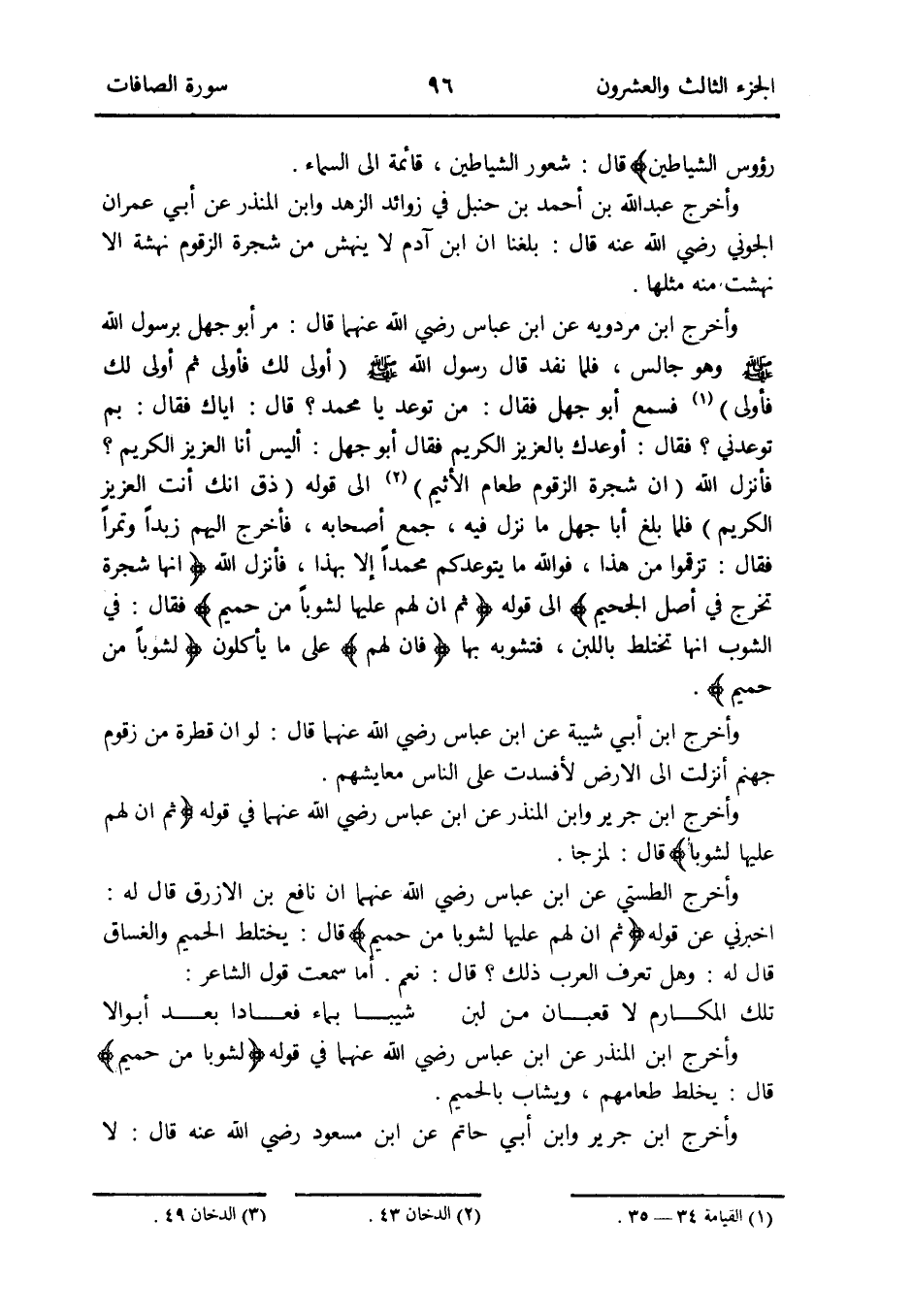 وَأخرج عبد الله بن أَحْمد بن حَنْبَل فِي زَوَائِد الزّهْد وَابْن الْمُنْذر عَن أبي عمرَان الْجونِي رَضِي الله عَنهُ قَالَ: بلغنَا أَن ابْن آدم لَا ينهش من شَجَرَة الزقوم نهشة إِلَّا نهشت مِنْهُ مثلهَا