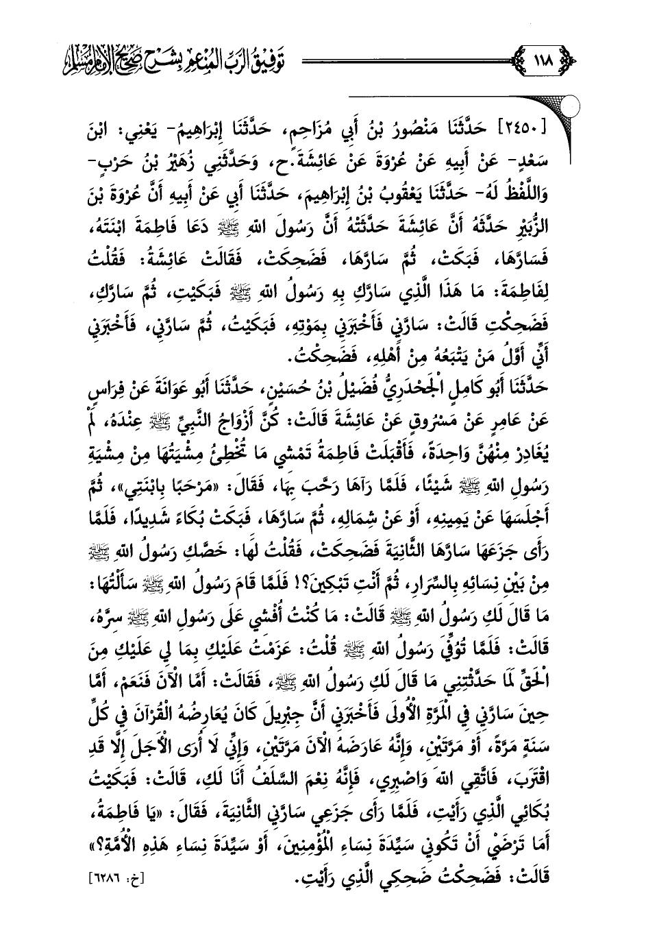 [٢٤٥٠] حَدَّثَنَا مَنْصُورُ بْنُ أَبِي مُزَاحِمٍ، حَدَّثَنَا إِبْرَاهِيمُ- يَعْنِي: ابْنَ سَعْدٍ- عَنْ أَبِيهِ عَنْ عُرْوَةَ عَنْ عَائِشَةَ. ح، وَحَدَّثَنِي زُهَيْرُ بْنُ حَرْبٍ- وَاللَّفْظُ لَهُ- حَدَّثَنَا يَعْقُوبُ بْنُ إِبْرَاهِيمَ، حَدَّثَنَا أَبِي عَنْ أَبِيهِ أَنَّ عُرْوَةَ بْنَ الزُّبَيْرِ حَدَّثَهُ أَنَّ عَائِشَةَ حَدَّثَتْهُ أَنَّ رَسُولَ اللَّهِ صلى الله عليه وسلم دَعَا فَاطِمَةَ ابْنَتَهُ، فَسَارَّهَا، فَبَكَتْ، ثُمَّ سَارَّهَا، فَضَحِكَتْ، فَقَالَتْ عَائِشَةُ: فَقُلْتُ لِفَاطِمَةَ: مَا هَذَا الَّذِي سَارَّكِ بِهِ رَسُولُ اللَّهِ صلى الله عليه وسلم فَبَكَيْتِ، ثُمَّ سَارَّكِ، فَضَحِكْتِ قَالَتْ: سَارَّنِي فَأَخْبَرَنِي بِمَوْتِهِ، فَبَكَيْتُ، ثُمَّ سَارَّنِي، فَأَخْبَرَنِي أَنِّي أَوَّلُ مَنْ يَتْبَعُهُ مِنْ أَهْلِهِ، فَضَحِكْتُ.