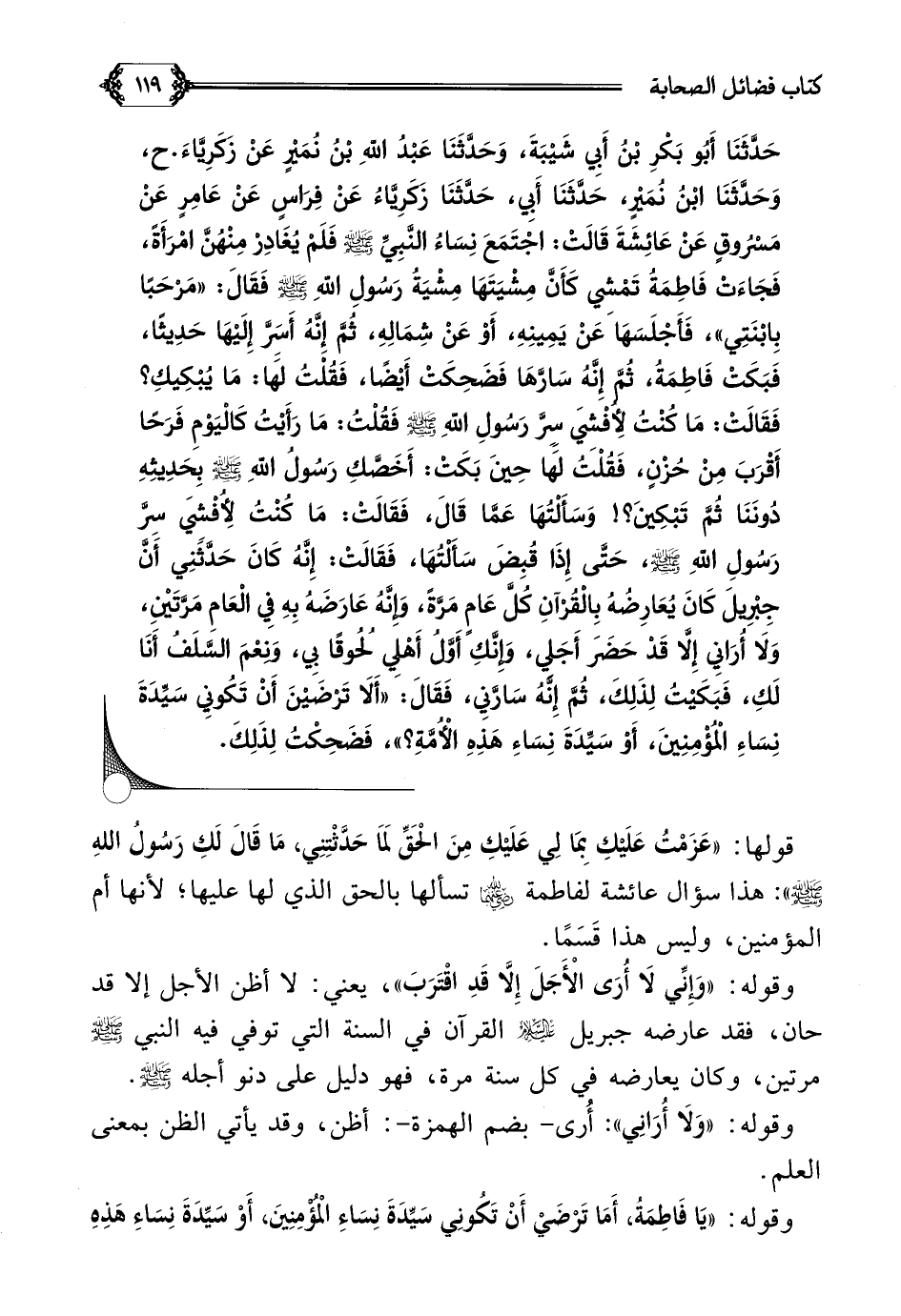 حَدَّثَنَا أَبُو بَكْرِ بْنُ أَبِي شَيْبَةَ، وَحَدَّثَنَا عَبْدُ اللَّهِ بْنُ نُمَيْرٍ عَنْ زَكَرِيَّاءَ. ح، وَحَدَّثَنَا ابْنُ نُمَيْرٍ، حَدَّثَنَا أَبِي، حَدَّثَنَا زَكَرِيَّاءُ عَنْ فِرَاسٍ عَنْ عَامِرٍ عَنْ مَسْرُوقٍ عَنْ عَائِشَةَ قَالَتْ: اجْتَمَعَ نِسَاءُ النَّبِيِّ صلى الله عليه وسلم فَلَمْ يُغَادِرْ مِنْهُنَّ امْرَأَةً، فَجَاءَتْ فَاطِمَةُ تَمْشِي كَأَنَّ مِشْيَتَهَا مِشْيَةُ رَسُولِ اللَّهِ صلى الله عليه وسلم فَقَالَ: ((مَرْحَبًا بِابْنَتِي))، فَأَجْلَسَهَا عَنْ يَمِينِهِ، أَوْ عَنْ شِمَالِهِ، ثُمَّ إِنَّهُ أَسَرَّ إِلَيْهَا حَدِيثًا، فَبَكَتْ فَاطِمَةُ، ثُمَّ إِنَّهُ سَارَّهَا فَضَحِكَتْ أَيْضًا، فَقُلْتُ لَهَا: مَا يُبْكِيكِ؟ فَقَالَتْ: مَا كُنْتُ لِأُفْشِيَ سِرَّ رَسُولِ اللَّهِ صلى الله عليه وسلم فَقُلْتُ: مَا رَأَيْتُ كَالْيَوْمِ فَرَحًا أَقْرَبَ مِنْ حُزْنٍ، فَقُلْتُ لَهَا حِينَ بَكَتْ: أَخَصَّكِ رَسُولُ اللَّهِ صلى الله عليه وسلم بِحَدِيثِهِ دُونَنَا ثُمَّ تَبْكِينَ؟ ! وَسَأَلْتُهَا عَمَّا قَالَ، فَقَالَتْ: مَا كُنْتُ لِأُفْشِيَ سِرَّ رَسُولِ اللَّهِ صلى الله عليه وسلم، حَتَّى إِذَا قُبِضَ سَأَلْتُهَا، فَقَالَتْ: إِنَّهُ كَانَ حَدَّثَنِي أَنَّ جِبْرِيلَ كَانَ يُعَارِضُهُ بِالْقُرْآنِ كُلَّ عَامٍ مَرَّةً، وَإِنَّهُ عَارَضَهُ بِهِ فِي الْعَامِ مَرَّتَيْنِ، وَلَا أُرَانِي إِلَّا قَدْ حَضَرَ أَجَلِي، وَإِنَّكِ أَوَّلُ أَهْلِي لُحُوقًا بِي، وَنِعْمَ السَّلَفُ أَنَا لَكِ، فَبَكَيْتُ لِذَلِكَ، ثُمَّ إِنَّهُ سَارَّنِي، فَقَالَ: ((أَلَا تَرْضَيْنَ أَنْ تَكُونِي سَيِّدَةَ نِسَاءِ الْمُؤْمِنِينَ، أَوْ سَيِّدَةَ نِسَاءِ هَذِهِ الْأُمَّةِ؟ ))،