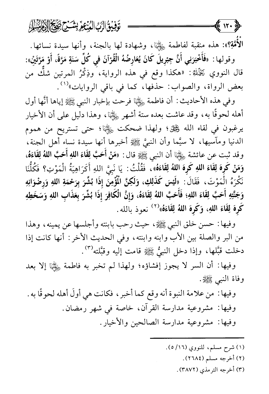 وفي هذه الأحاديث: أن فاطمة رضي الله عنها فرحت بإخبار النبي صلى الله عليه وسلم إياها أنَّها أول أهله لحوقًا به، وقد عاشت بعده ستة أشهر رضي الله عنها، وهذا دليل على أن الأخيار يرغبون في لقاء الله عز وجل؛ ولهذا ضحكت رضي الله عنها؛ حتى تستريح من هموم الدنيا ومآسيها، لا سيَّما وأن النبيَّ صلى الله عليه وسلم أخبرها أنها سيدة نساء أهل الجنة، وقد ثبت عن عائشة رضي الله عنها أن النبي صلى الله عليه وسلم قال: ((مَنْ أَحَبَّ لِقَاءَ اللهِ أَحَبَّ اللهُ لِقَاءَهُ، وَمَنْ كَرِهَ لِقَاءَ اللهِ كَرِهَ اللهُ لِقَاءَهُ))، فَقُلْتُ: يَا نَبِيَّ اللهِ أَكَرَاهِيَةُ الْمَوْتِ؟ فَكُلُّنَا نَكْرَهُ الْمَوْتَ، فَقَالَ: ((لَيْسَ كَذَلِكِ، وَلَكِنَّ الْمُؤْمِنَ إِذَا بُشِّرَ بِرَحْمَةِ اللهِ وَرِضْوَانِهِ وَجَنَّتِهِ أَحَبَّ لِقَاءَ اللهِ؛ فَأَحَبَّ اللهُ لِقَاءَهُ، وَإِنَّ الْكَافِرَ إِذَا بُشِّرَ بِعَذَابِ اللهِ وَسَخَطِهِ كَرِهَ لِقَاءَ اللهِ، وَكَرِهَ اللهُ لِقَاءَهُ)) (¬٢) نعوذ بالله.