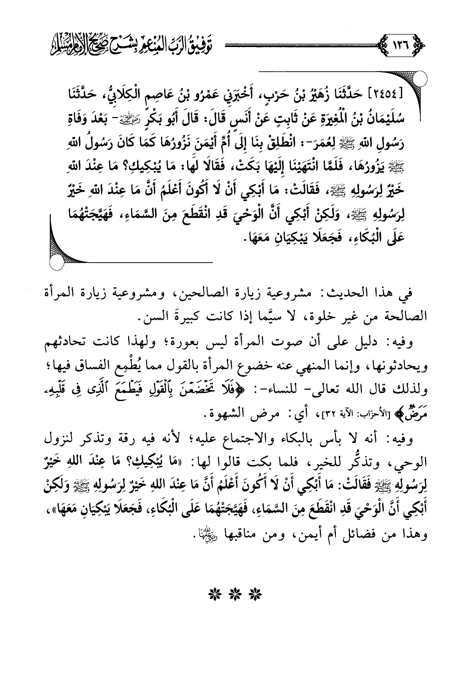 [٢٤٥٤] حَدَّثَنَا زُهَيْرُ بْنُ حَرْبٍ، أَخْبَرَنِي عَمْرُو بْنُ عَاصِمٍ الْكِلَابِيُّ، حَدَّثَنَا سُلَيْمَانُ بْنُ الْمُغِيرَةِ عَنْ ثَابِتٍ عَنْ أَنَسٍ قَالَ: قَالَ أَبُو بَكْرٍ رضي الله عنه- بَعْدَ وَفَاةِ رَسُولِ اللَّهِ صلى الله عليه وسلم لِعُمَرَ-: انْطَلِقْ بِنَا إِلَى أُمِّ أَيْمَنَ نَزُورُهَا كَمَا كَانَ رَسُولُ اللَّهِ صلى الله عليه وسلم يَزُورُهَا، فَلَمَّا انْتَهَيْنَا إِلَيْهَا بَكَتْ، فَقَالَا لَهَا: مَا يُبْكِيكِ؟ مَا عِنْدَ اللَّهِ خَيْرٌ لِرَسُولِهِ صلى الله عليه وسلم، فَقَالَتْ: مَا أَبْكِي أَنْ لَا أَكُونَ أَعْلَمُ أَنَّ مَا عِنْدَ اللَّهِ خَيْرٌ لِرَسُولِهِ صلى الله عليه وسلم، وَلَكِنْ أَبْكِي أَنَّ الْوَحْيَ قَدِ انْقَطَعَ مِنَ السَّمَاءِ، فَهَيَّجَتْهُمَا عَلَى الْبُكَاءِ، فَجَعَلَا يَبْكِيَانِ مَعَهَا.