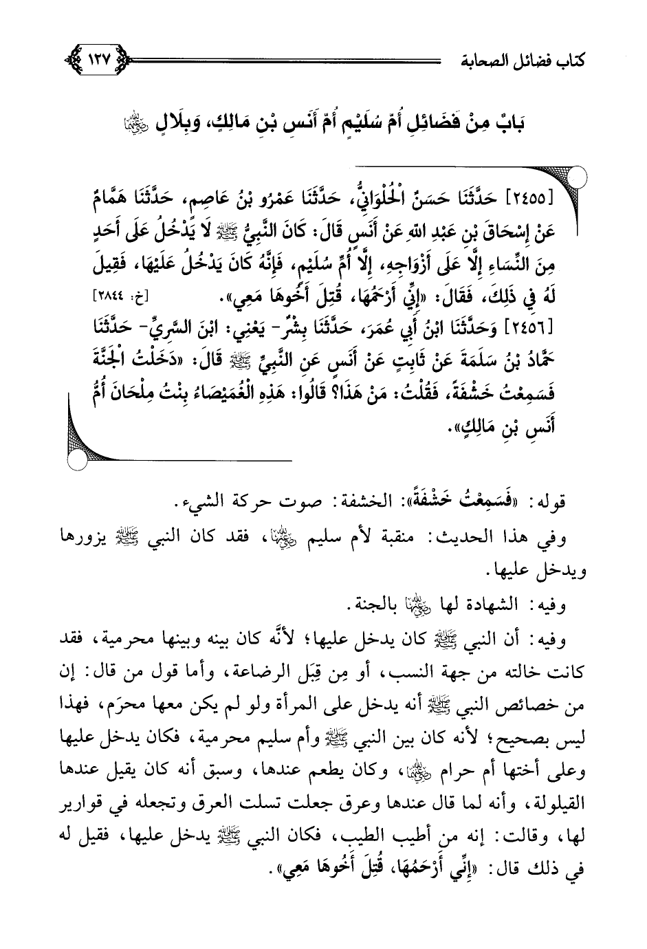 [٢٤٥٦] وَحَدَّثَنَا ابْنُ أَبِي عُمَرَ، حَدَّثَنَا بِشْرٌ- يَعْنِي: ابْنَ السَّرِيِّ- حَدَّثَنَا حَمَّادُ بْنُ سَلَمَةَ عَنْ ثَابِتٍ عَنْ أَنَسٍ عَنِ النَّبِيِّ صلى الله عليه وسلم قَالَ: ((دَخَلْتُ الْجَنَّةَ فَسَمِعْتُ خَشْفَةً، فَقُلْتُ: مَنْ هَذَا؟ قَالُوا: هَذِهِ الْغُمَيْصَاءُ بِنْتُ مِلْحَانَ أُمُّ أَنَسِ بْنِ مَالِكٍ)).