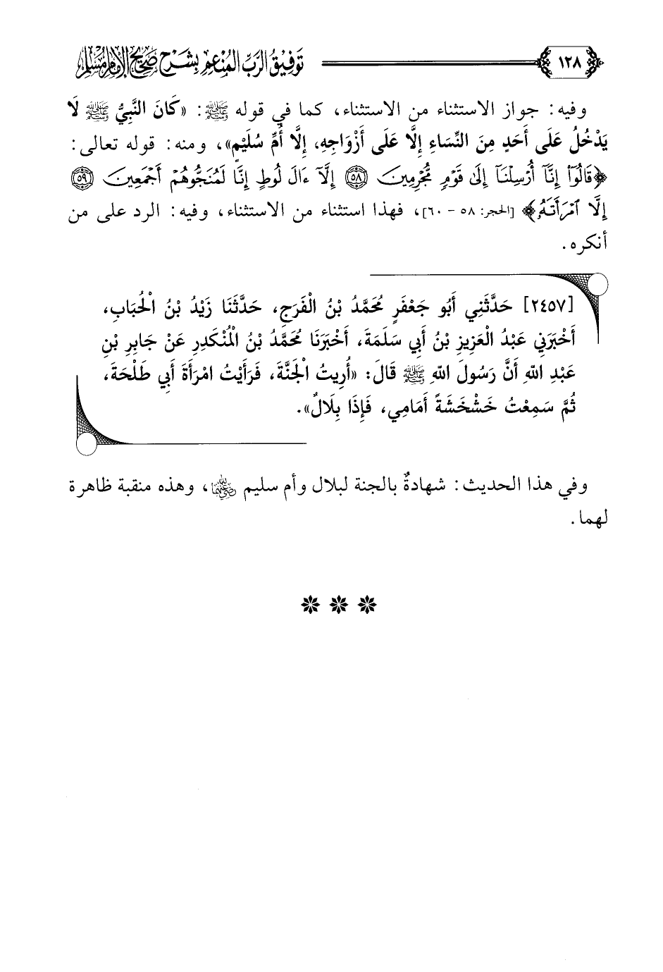 [٢٤٥٧] حَدَّثَنِي أَبُو جَعْفَرٍ مُحَمَّدُ بْنُ الْفَرَجِ، حَدَّثَنَا زَيْدُ بْنُ الْحُبَابِ، أَخْبَرَنِي عَبْدُ الْعَزِيزِ بْنُ أَبِي سَلَمَةَ، أَخْبَرَنَا مُحَمَّدُ بْنُ الْمُنْكَدِرِ عَنْ جَابِرِ بْنِ عَبْدِ اللَّهِ أَنَّ رَسُولَ اللَّهِ صلى الله عليه وسلم قَالَ: ((أُرِيتُ الْجَنَّةَ، فَرَأَيْتُ امْرَأَةَ أَبِي طَلْحَةَ، ثُمَّ سَمِعْتُ خَشْخَشَةً أَمَامِي، فَإِذَا بِلَالٌ)).