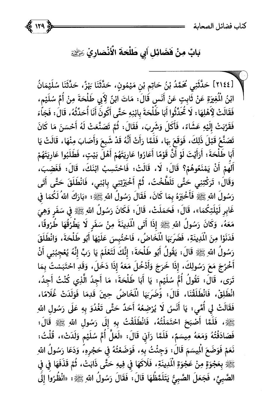 [٢١٤٤] حَدَّثَنِي مُحَمَّدُ بْنُ حَاتِمِ بْنِ مَيْمُونٍ، حَدَّثَنَا بَهْزٌ، حَدَّثَنَا سُلَيْمَانُ بْنُ الْمُغِيرَةِ عَنْ ثَابِتٍ عَنْ أَنَسٍ قَالَ: مَاتَ ابْنٌ لِأَبِي طَلْحَةَ مِنْ أُمِّ سُلَيْمٍ، فَقَالَتْ لِأَهْلِهَا: لَا تُحَدِّثُوا أَبَا طَلْحَةَ بِابْنِهِ حَتَّى أَكُونَ أَنَا أُحَدِّثُهُ، قَالَ: فَجَاءَ فَقَرَّبَتْ إِلَيْهِ عَشَاءً، فَأَكَلَ وَشَرِبَ، فَقَالَ: ثُمَّ تَصَنَّعَتْ لَهُ أَحْسَنَ مَا كَانَ تَصَنَّعُ قَبْلَ ذَلِكَ، فَوَقَعَ بِهَا، فَلَمَّا رَأَتْ أَنَّهُ قَدْ شَبِعَ وَأَصَابَ مِنْهَا، قَالَتْ يَا أَبَا طَلْحَةَ: أَرَأَيْتَ لَوْ أَنَّ قَوْمًا أَعَارُوا عَارِيَتَهُمْ أَهْلَ بَيْتٍ، فَطَلَبُوا عَارِيَتَهُمْ أَلَهُمْ أَنْ يَمْنَعُوهُمْ؟ قَالَ: لَا، قَالَتْ: فَاحْتَسِبْ ابْنَكَ، قَالَ: فَغَضِبَ، وَقَالَ: تَرَكْتِنِي حَتَّى تَلَطَّخْتُ، ثُمَّ أَخْبَرْتِنِي بِابْنِي، فَانْطَلَقَ حَتَّى أَتَى رَسُولَ اللَّهِ صلى الله عليه وسلم فَأَخْبَرَهُ بِمَا كَانَ، فَقَالَ رَسُولُ اللَّهِ صلى الله عليه وسلم: ((بَارَكَ اللَّهُ لَكُمَا فِي غَابِرِ لَيْلَتِكُمَا))، قَالَ: فَحَمَلَتْ، قَالَ: فَكَانَ رَسُولُ اللَّهِ صلى الله عليه وسلم فِي سَفَرٍ وَهِيَ مَعَهُ، وَكَانَ رَسُولُ اللَّهِ صلى الله عليه وسلم إِذَا أَتَى الْمَدِينَةَ مِنْ سَفَرٍ لَا يَطْرُقُهَا طُرُوقًا، فَدَنَوْا مِنْ الْمَدِينَةِ، فَضَرَبَهَا الْمَخَاضُ، فَاحْتُبِسَ عَلَيْهَا أَبُو طَلْحَةَ، وَانْطَلَقَ رَسُولُ اللَّهِ صلى الله عليه وسلم قَالَ: يَقُولُ أَبُو طَلْحَةَ: إِنَّكَ لَتَعْلَمُ يَا رَبِّ إِنَّهُ يُعْجِبُنِي أَنْ أَخْرُجَ مَعَ رَسُولِكَ، إِذَا خَرَجَ وَأَدْخُلَ مَعَهُ إِذَا دَخَلَ، وَقَدِ احْتَبَسْتُ بِمَا تَرَى، قَالَ: تَقُولُ أُمُّ سُلَيْمٍ: