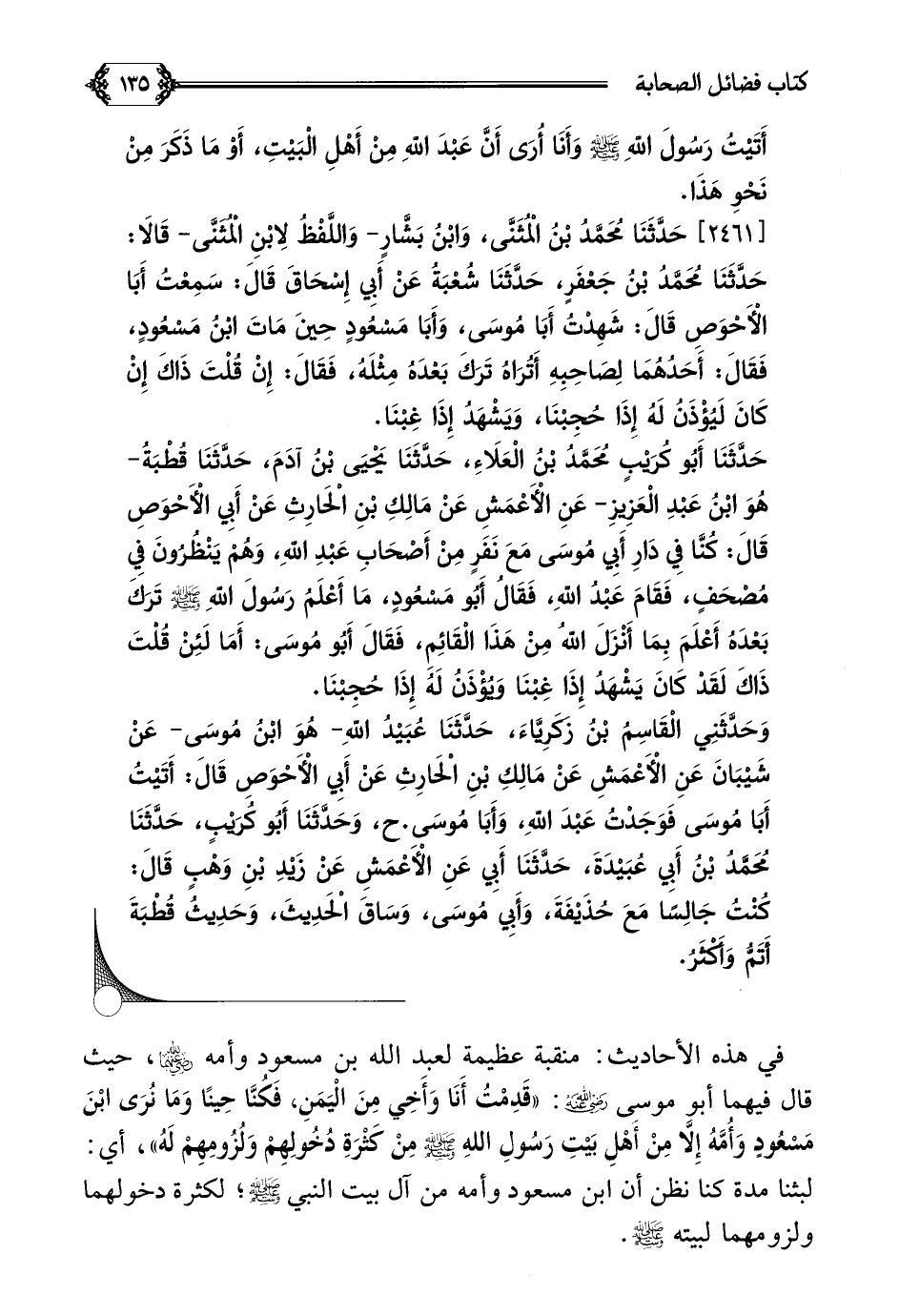حَدَّثَنَا أَبُو كُرَيْبٍ مُحَمَّدُ بْنُ الْعَلَاءِ، حَدَّثَنَا يَحْيَى بْنُ آدَمَ، حَدَّثَنَا قُطْبَةُ- هُوَ ابْنُ عَبْدِ الْعَزِيزِ- عَنِ الْأَعْمَشِ عَنْ مَالِكِ بْنِ الْحَارِثِ عَنْ أَبِي الْأَحْوَصِ قَالَ: كُنَّا فِي دَارِ أَبِي مُوسَى مَعَ نَفَرٍ مِنْ أَصْحَابِ عَبْدِ اللَّهِ، وَهُمْ يَنْظُرُونَ فِي مُصْحَفٍ، فَقَامَ عَبْدُ اللَّهِ، فَقَالُ أَبُو مَسْعُودٍ، مَا أَعْلَمُ رَسُولَ اللَّهِ صلى الله عليه وسلم تَرَكَ بَعْدَهُ أَعْلَمَ بِمَا أَنْزَلَ اللَّهُ مِنْ هَذَا الْقَائِمِ، فَقَالَ أَبُو مُوسَى: أَمَا لَئِنْ قُلْتَ ذَاكَ لَقَدْ كَانَ يَشْهَدُ إِذَا غِبْنَا وَيُؤْذَنُ لَهُ إِذَا حُجِبْنَا.