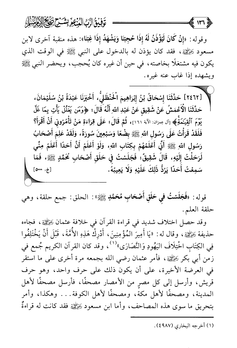 [٢٤٦٢] حَدَّثَنَا إِسْحَاقُ بْنُ إِبْرَاهِيمَ الْحَنْظَلِيُّ، أَخْبَرَنَا عَبْدَةُ بْنُ سُلَيْمَانَ، حَدَّثَنَا الْأَعْمَشُ عَنْ شَقِيقٍ عَنْ عَبْدِ اللَّهِ أَنَّهُ قَالَ: {وَمَنْ يَغْلُلْ يَأْتِ بِمَا غَلَّ يَوْمَ الْقِيَامَةِ}، ثُمَّ قَالَ: عَلَى قِرَاءَةِ مَنْ تَأْمُرُونِي أَنْ أَقْرَأَ؟ فَلَقَدْ قَرَأْتُ عَلَى رَسُولِ اللَّهِ صلى الله عليه وسلم بِضْعًا وَسَبْعِينَ سُورَةً، وَلَقَدْ عَلِمَ أَصْحَابُ رَسُولِ اللَّهِ صلى الله عليه وسلم أَنِّي أَعْلَمُهُمْ بِكِتَابِ اللَّهِ، وَلَوْ أَعْلَمُ أَنَّ أَحَدًا أَعْلَمُ مِنِّي لَرَحَلْتُ إِلَيْهِ، قَالَ شَقِيقٌ: فَجَلَسْتُ فِي حَلَقِ أَصْحَابِ مُحَمَّدٍ صلى الله عليه وسلم، فَمَا سَمِعْتُ أَحَدًا يَرُدُّ ذَلِكَ عَلَيْهِ وَلَا يَعِيبُهُ.