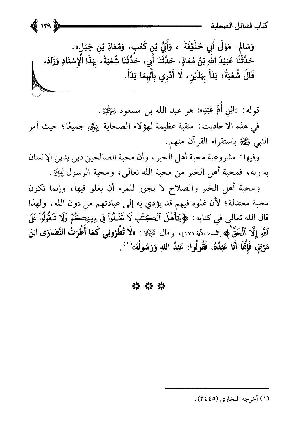 ومحبة أهل الخير والصلاح لا يجوز للمرء أن يغلو فيها، وإنما تكون محبة معتدلة؛ لأن غلوه فيهم قد يؤدي به إلى عبادتهم من دون الله، ولهذا قال الله تعالى في كتابه: {يا أهل الكتاب لا تغلوا في دينكم ولا تقولوا على الله إلا الحق}، وقال عليه السلام: ((لا تُطْرُونِي كَمَا أَطْرَتْ النَّصَارَى ابْنَ مَرْيَمَ، فَإِنَّمَا أَنَا عَبْدُهُ، فَقُولُوا: عَبْدُ اللَّهِ وَرَسُولُهُ)) (¬١).