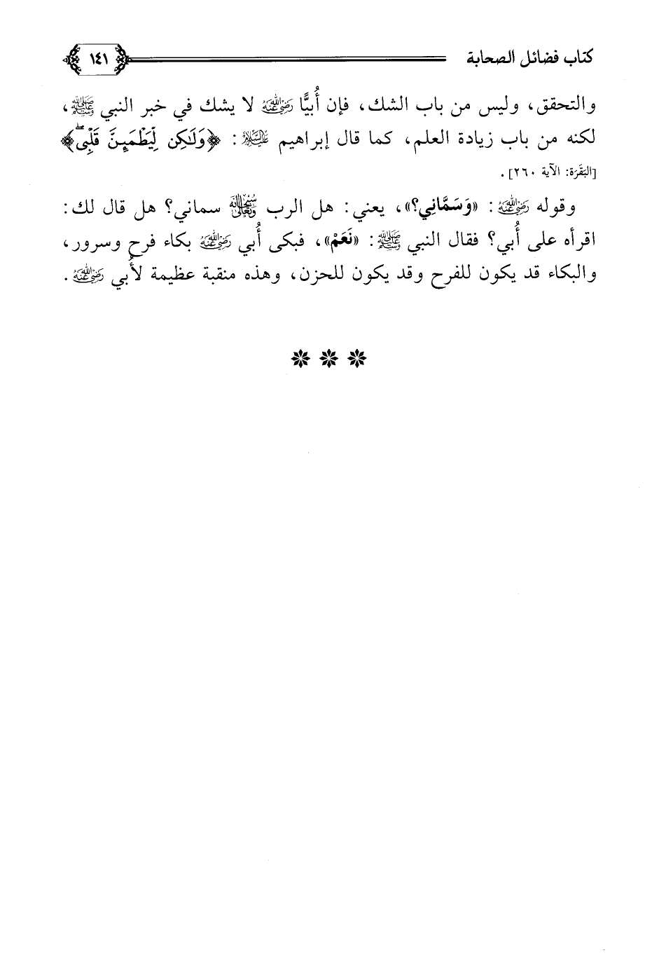 والتحقق، وليس من باب الشك، فإن أُبيًّا رضي الله عنه لا يشك في خبر النبي صلى الله عليه وسلم، لكنه من باب زيادة العلم، كما قال إبراهيم عليه السلام: {ولكن ليطمئن قلبي}.