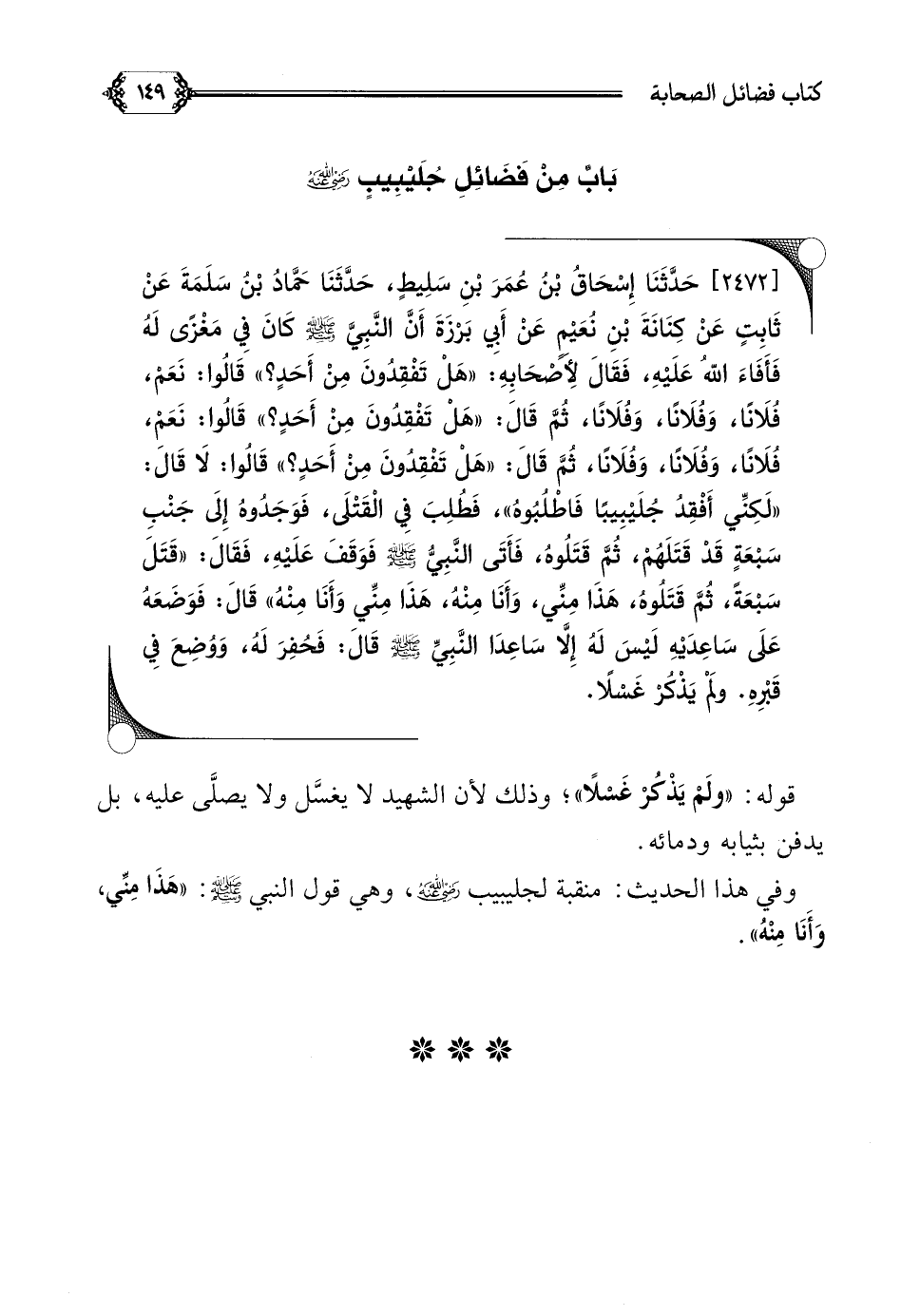 [٢٤٧٢] حَدَّثَنَا إِسْحَاقُ بْنُ عُمَرَ بْنِ سَلِيطٍ، حَدَّثَنَا حَمَّادُ بْنُ سَلَمَةَ عَنْ ثَابِتٍ عَنْ كِنَانَةَ بْنِ نُعَيْمٍ عَنْ أَبِي بَرْزَةَ أَنَّ النَّبِيَّ صلى الله عليه وسلم كَانَ فِي مَغْزًى لَهُ فَأَفَاءَ اللَّهُ عَلَيْهِ، فَقَالَ لِأَصْحَابِهِ: ((هَلْ تَفْقِدُونَ مِنْ أَحَدٍ؟ )) قَالُوا: نَعَمْ، فُلَانًا، وَفُلَانًا، وَفُلَانًا، ثُمَّ قَالَ: ((هَلْ تَفْقِدُونَ مِنْ أَحَدٍ؟ )) قَالُوا: نَعَمْ، فُلَانًا، وَفُلَانًا، وَفُلَانًا، ثُمَّ قَالَ: ((هَلْ تَفْقِدُونَ مِنْ أَحَدٍ؟ )) قَالُوا: لَا قَالَ: ((لَكِنِّي أَفْقِدُ جُلَيْبِيبًا فَاطْلُبُوهُ))، فَطُلِبَ فِي الْقَتْلَى، فَوَجَدُوهُ إِلَى جَنْبِ سَبْعَةٍ قَدْ قَتَلَهُمْ، ثُمَّ قَتَلُوهُ، فَأَتَى النَّبِيُّ صلى الله عليه وسلم فَوَقَفَ عَلَيْهِ، فَقَالَ: ((قَتَلَ سَبْعَةً، ثُمَّ قَتَلُوهُ، هَذَا مِنِّي، وَأَنَا مِنْهُ، هَذَا مِنِّي وَأَنَا مِنْهُ)) قَالَ: فَوَضَعَهُ عَلَى سَاعِدَيْهِ لَيْسَ لَهُ إِلَّا سَاعِدَا النَّبِيِّ صلى الله عليه وسلم قَالَ: فَحُفِرَ لَهُ، وَوُضِعَ فِي قَبْرِهِ. ولَمْ يَذْكُرْ غَسْلًا.
