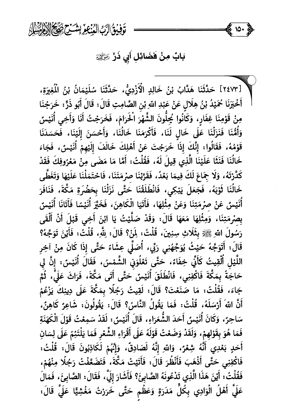 [٢٤٧٣] حَدَّثَنَا هَدَّابُ بْنُ خَالِدٍ الْأَزْدِيُّ، حَدَّثَنَا سُلَيْمَانُ بْنُ الْمُغِيرَةِ، أَخْبَرَنَا حُمَيْدُ بْنُ هِلَالٍ عَنْ عَبْدِ اللَّهِ بْنِ الصَّامِتِ قَالَ: قَالَ أَبُو ذَرٍّ: خَرَجْنَا مِنْ قَوْمِنَا غِفَارٍ، وَكَانُوا يُحِلُّونَ الشَّهْرَ الْحَرَامَ، فَخَرَجْتُ أَنَا وَأَخِي أُنَيْسٌ وَأُمُّنَا فَنَزَلْنَا عَلَى خَالٍ لَنَا، فَأَكْرَمَنَا خَالُنَا، وَأَحْسَنَ إِلَيْنَا، فَحَسَدَنَا قَوْمُهُ، فَقَالُوا: إِنَّكَ إِذَا خَرَجْتَ عَنْ أَهْلِكَ خَالَفَ إِلَيْهِمْ أُنَيْسٌ، فَجَاءَ خَالُنَا فَنَثَا عَلَيْنَا الَّذِي قِيلَ لَهُ، فَقُلْتُ: أَمَّا مَا مَضَى مِنْ مَعْرُوفِكَ فَقَدْ كَدَّرْتَهُ، وَلَا جِمَاعَ لَكَ فِيمَا بَعْدُ، فَقَرَّبْنَا صِرْمَتَنَا، فَاحْتَمَلْنَا عَلَيْهَا وَتَغَطَّى خَالُنَا ثَوْبَهُ، فَجَعَلَ يَبْكِي، فَانْطَلَقْنَا حَتَّى نَزَلْنَا بِحَضْرَةِ مَكَّةَ، فَنَافَرَ أُنَيْسٌ عَنْ صِرْمَتِنَا وَعَنْ مِثْلِهَا، فَأَتَيَا الْكَاهِنَ، فَخَيَّرَ أُنَيْسًا فَأَتَانَا أُنَيْسٌ بِصِرْمَتِنَا، وَمِثْلِهَا مَعَهَا قَالَ: وَقَدْ صَلَّيْتُ يَا ابْنَ أَخِي قَبْلَ أَنْ أَلْقَى رَسُولَ اللَّهِ صلى الله عليه وسلم بِثَلَاثِ سِنِينَ، قُلْتُ: لِمَنْ؟ قَالَ: لِلَّهِ، قُلْتُ: فَأَيْنَ تَوَجَّهُ؟ قَالَ: أَتَوَجَّهُ حَيْثُ يُوَجِّهُنِي رَبِّي، أُصَلِّي عِشَاءً حَتَّى إِذَا كَانَ مِنْ آخِرِ اللَّيْلِ أُلْقِيتُ كَأَنِّي خِفَاءٌ، حَتَّى تَعْلُوَنِي الشَّمْسُ، فَقَالَ أُنَيْسٌ: إِنَّ لِي حَاجَةً بِمَكَّةَ فَاكْفِنِي، فَانْطَلَقَ أُنَيْسٌ حَتَّى أَتَى مَكَّةَ، فَرَاثَ عَلَيَّ، ثُمَّ جَاءَ، فَقُلْتُ: مَا صَنَعْتَ؟ قَالَ: لَقِيتُ رَجُلًا بِمَكَّةَ عَلَى دِينِكَ يَزْعُمُ أَنَّ اللَّهَ أَرْسَلَهُ، قُلْتُ: فَمَا يَقُولُ النَّاسُ؟ قَالَ: يَقُولُونَ: شَاعِرٌ كَاهِنٌ، سَاحِرٌ،