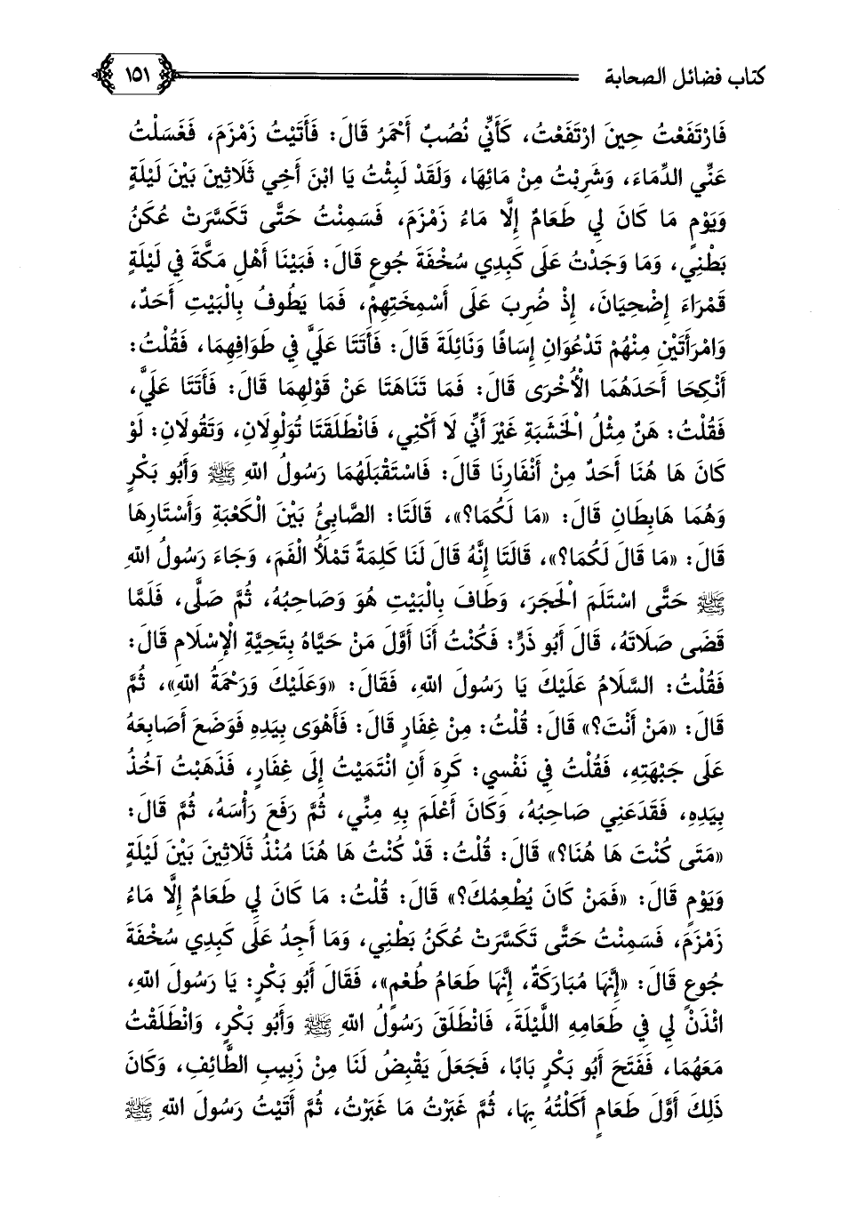 وَأَسْتَارِهَا قَالَ: ((مَا قَالَ لَكُمَا؟ ))، قَالَتَا إِنَّهُ قَالَ لَنَا كَلِمَةً تَمْلَأُ الْفَمَ، وَجَاءَ رَسُولُ اللَّهِ صلى الله عليه وسلم حَتَّى اسْتَلَمَ الْحَجَرَ، وَطَافَ بِالْبَيْتِ هُوَ وَصَاحِبُهُ، ثُمَّ صَلَّى، فَلَمَّا قَضَى صَلَاتَهُ، قَالَ أَبُو ذَرٍّ: فَكُنْتُ أَنَا أَوَّلَ مَنْ حَيَّاهُ بِتَحِيَّةِ الْإِسْلَامِ قَالَ: فَقُلْتُ: السَّلَامُ عَلَيْكَ يَا رَسُولَ اللَّهِ، فَقَالَ: ((وَعَلَيْكَ وَرَحْمَةُ اللَّهِ))، ثُمَّ قَالَ: ((مَنْ أَنْتَ؟ )) قَالَ: قُلْتُ: مِنْ غِفَارٍ قَالَ: فَأَهْوَى بِيَدِهِ فَوَضَعَ أَصَابِعَهُ عَلَى جَبْهَتِهِ، فَقُلْتُ فِي نَفْسِي: كَرِهَ أَنِ انْتَمَيْتُ إِلَى غِفَارٍ، فَذَهَبْتُ آخُذُ بِيَدِهِ، فَقَدَعَنِي صَاحِبُهُ، وَكَانَ أَعْلَمَ بِهِ مِنِّي، ثُمَّ رَفَعَ رَأْسَهُ، ثُمَّ قَالَ: ((مَتَى كُنْتَ هَا هُنَا؟ )) قَالَ: قُلْتُ: قَدْ كُنْتُ هَا هُنَا مُنْذُ ثَلَاثِينَ بَيْنَ لَيْلَةٍ وَيَوْمٍ قَالَ: ((فَمَنْ كَانَ يُطْعِمُكَ؟ )) قَالَ: قُلْتُ: مَا كَانَ لِي طَعَامٌ إِلَّا مَاءُ زَمْزَمَ، فَسَمِنْتُ حَتَّى تَكَسَّرَتْ عُكَنُ بَطْنِي، وَمَا أَجِدُ عَلَى كَبِدِي سُخْفَةَ جُوعٍ قَالَ: ((إِنَّهَا مُبَارَكَةٌ، إِنَّهَا طَعَامُ طُعْمٍ))، فَقَالَ أَبُو بَكْرٍ: يَا رَسُولَ اللَّهِ، ائْذَنْ لِي فِي طَعَامِهِ اللَّيْلَةَ، فَانْطَلَقَ رَسُولُ اللَّهِ صلى الله عليه وسلم وَأَبُو بَكْرٍ، وَانْطَلَقْتُ مَعَهُمَا، فَفَتَحَ أَبُو بَكْرٍ بَابًا، فَجَعَلَ يَقْبِضُ لَنَا مِنْ زَبِيبِ الطَّائِفِ، وَكَانَ ذَلِكَ أَوَّلَ طَعَامٍ أَكَلْتُهُ بِهَا، ثُمَّ غَبَرْتُ مَا غَبَرْتُ، ثُمَّ أَتَيْتُ رَسُولَ اللَّهِ صلى الله عليه وسلم